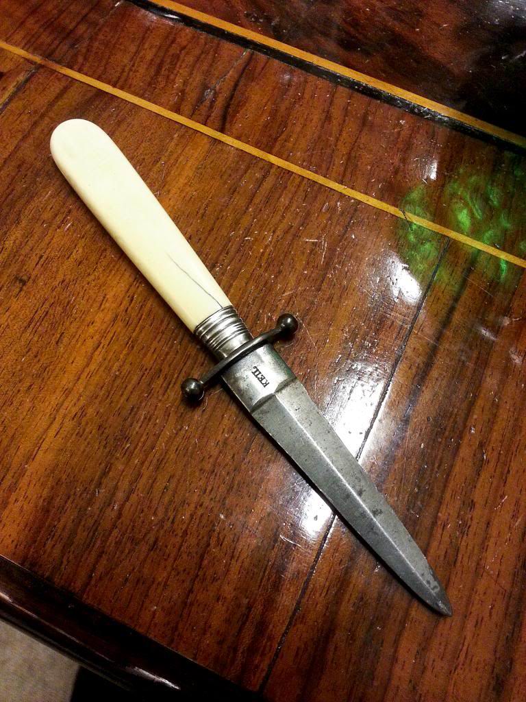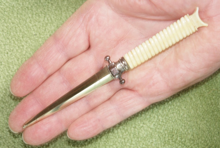 Diese kleinen Dolche oder Stilette waren im Frankreich des neunzehnten Jahrhunderts unter der Bezeichnung "pique couille" bekannt. Sie wurden von den einschlägigen Damen zur Selbstverteidigung gegen brutale oder betrunkene Freier, unter dem Rock verborgen, getragen. Hier in Deutschland haben sie die etwas profanere Bezeichnung