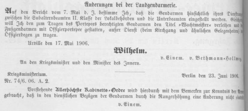1906 wurde den preußischen Fußgendarmen außer Dienst auch der Infanterie-Offizier-Degen gestattet. Die hier zitierte Gestattung ist nicht so auszulegen, daß den Gendarmerie Wachtmeistern die Stücke dienstlich gestellt wurden. Wer wollte, durfte – und mußt den Degen selbst käuflich erwerben!