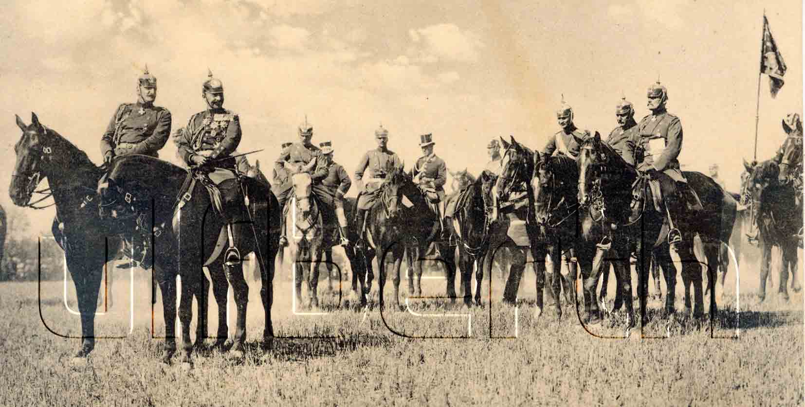 WII mit Offizieren und (mit Zylinder) Bedienstete des preußischen Hofstaats. Rechts im Bild die Kaiserstandarte.