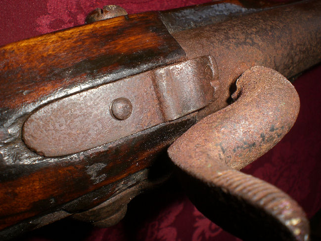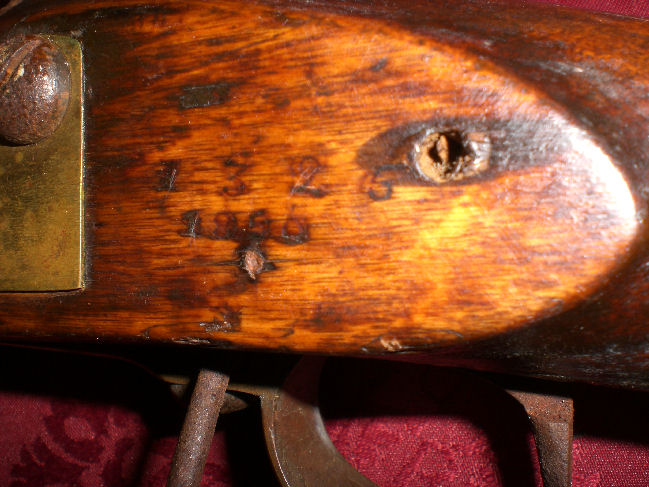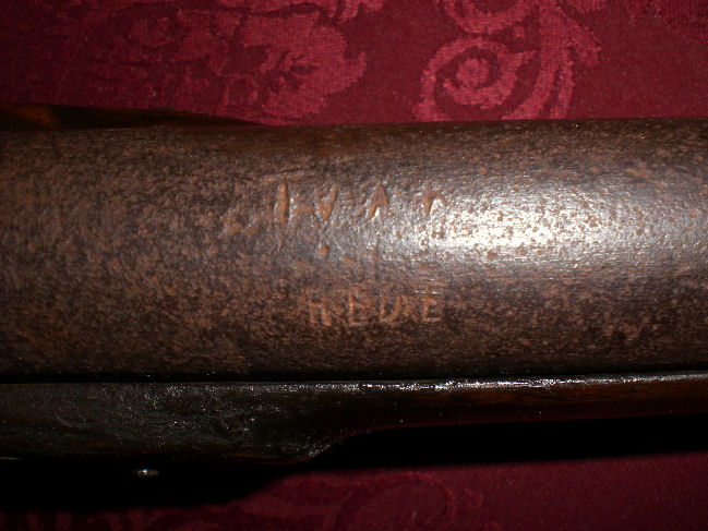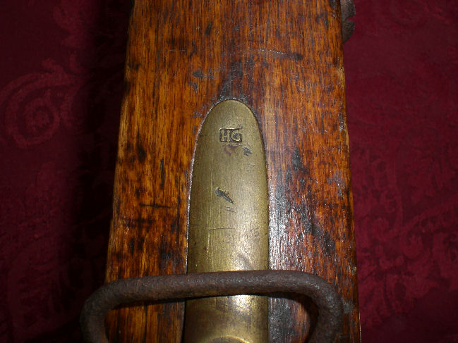 Dieses messingmontierte Infanteriegewehr m. Bajonetthalterung kann ich nicht zuordnen. Da dieses Gewehr mit glattem Lauf seit sehr langer Zeit ungeöffnet ist, keine der Schrauben zeigt eine Gebrauchsspur, möchte ich zunächst auf diesem Weg eine eventuelle Identifizierung herbeiführen u. die sichtbar vorhandenen Stempel zeigen.Die Laufringe auch mit verputzem Stempel, diese kann ich aber nicht deutlich erfassen. Die Schlossplatte zeigt eine undeutliche Krone, durch die Formatierung kaum sichtbar, ( Adler ) darunter t/t oder ( NM )?. Der darunter befindl. Schriftzug endet mit einem " G ". Auf dem Winkel der Gegenplatte event. wieder eine Krone o. Adler, sehr verputzt. Lauf, Schaft, Kolbenblech mit der Zahl " 1325 "gestempelt. Abzugbügel vorn " HG ", hinten wieder kleine Krone oder Adler. Schloss und Lauf ließen sich problemlos entfernen,es könnten weitere Stempel / Zahlen sichtbar werden, aber dann ist die Unberührtheit beendet. Wer gibt mir den guten Rat, so lassen oder öffnen ?! Gesamtlänge 147 cm. Kal. 20mm. Gruß, sonjar PS.: Der Stempel, letztes Bild, wurde nach Vergrößerung vom PC abfotogr. leider sehr schlecht sichtbar.