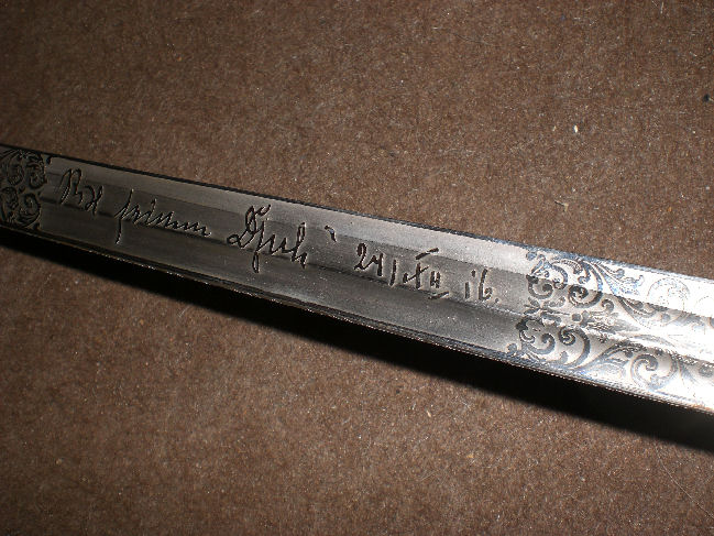 Eventuell, hat die " 25 " u. Inschrift eine doppelte Bedeutung, dienstliches Jubiläum, die " 25 " mit grünem Untergrund, auf einem Eichenblatt. Weihnachtsgeschenk,in Verbindung mit der Klingeninschrift, " Six seinem Dju(h) li " ? 24/XII 16. Das Eichenblatt, ein möglicher Hinweis auf ein Jäger - Regiment ?! Kein Hersteller. Gesamtlänge 91 cm. Klinge 74 cm. Klingenbr. 2.3 cm. Scheide, mit einem Band, einer Öse, einem Ring. Vielleicht, wurde diese sehr " persönliche " Anrede ( Six / Dju(h)li ) schon einmal, militärisch vergleichbar erwähnt... Gruß sonjar