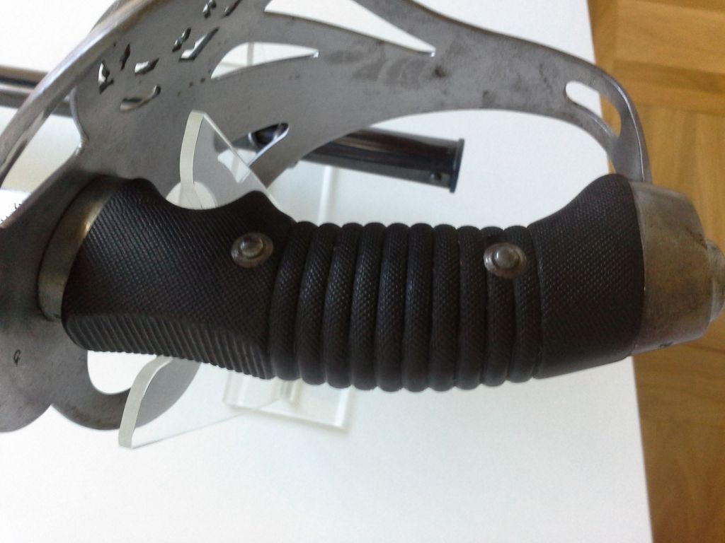 um so einen besseren Halt in der Hand zu bieten, sowie die Klinge, die der des preußischen Kavalleriesäbels M 1852 in der Ausführung seit 1879 entspricht.