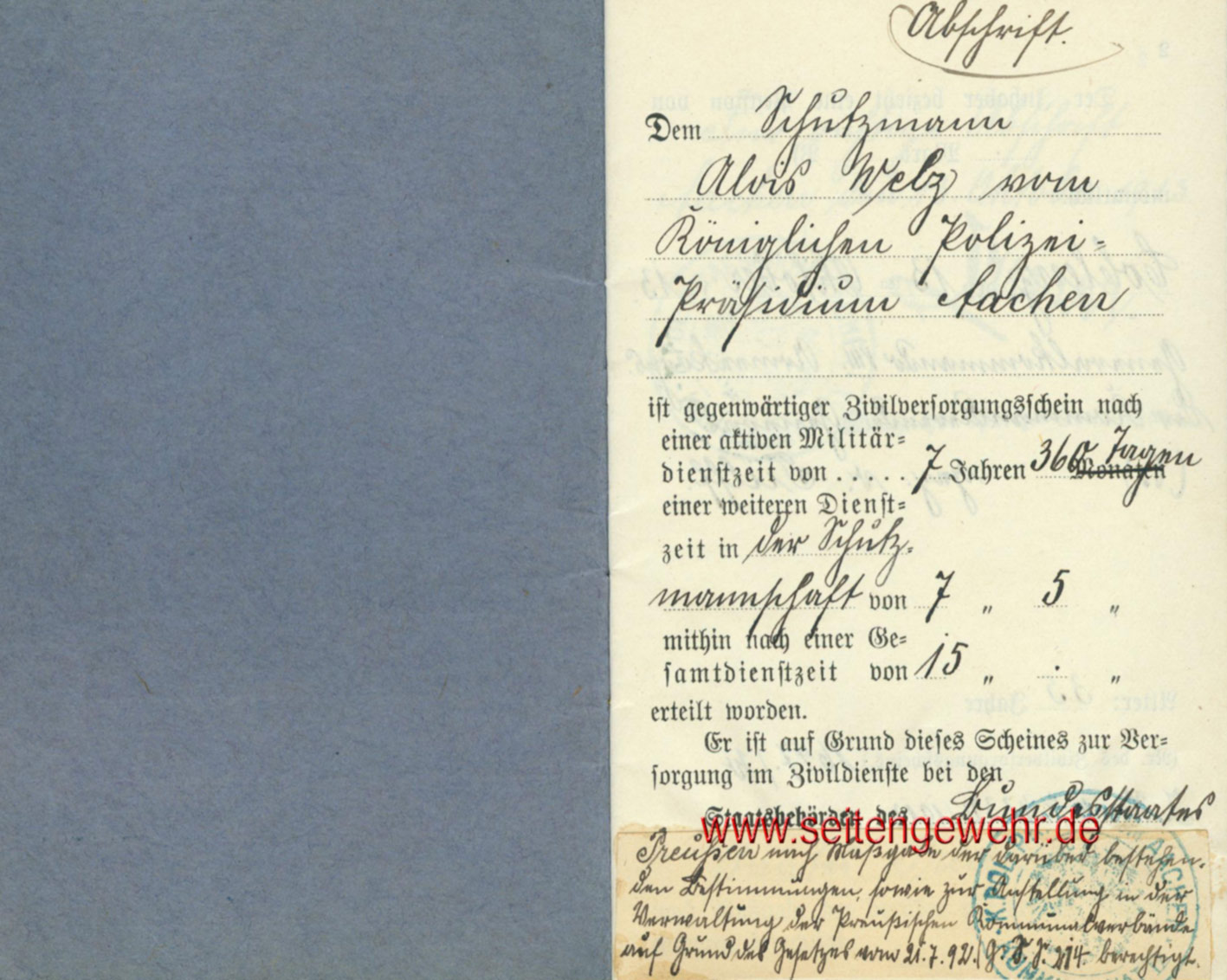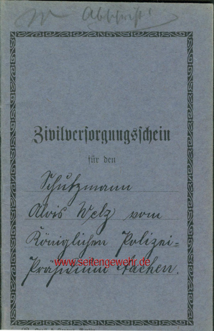 Daneben gibt es auch eine Zwischenlösung, wie der hier wiedergegebene Zivilversorgungsschein für den Schutzmann Alois Welz der Königlichen Schutzmannschaft Aachen zeigt. Erst Militär, dann eine Zivilbehörde wie die Schutzmannschaft Aachen und erst dann den zivile Versorgung.