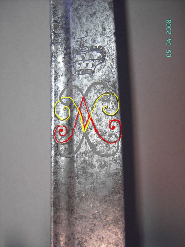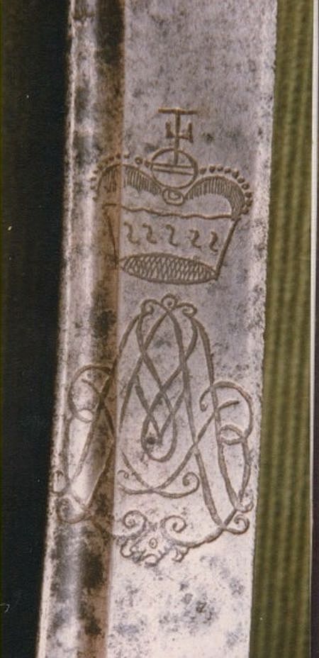 Die Schreibweise dieses Monogramms als "AV" wird bei Flämig bestätigt. Sachsen-Meiningen hatte zum Zeitpunkt der Regentschaft von Anton Ulrich eine Grenadier-Kompanie und ein Jägerkorps mit 20 Mann. Die Grenadierkompanie war zu Beginn des Siebenjährigen Krieges 80 Mann stark. Diesem Verband dürfte der Infanteriesäbel zuzuschreiben sein.