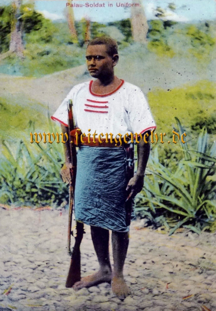 Den besten Ruf als Soldaten genossen früher die Bukas. Die Insel Buka (Salomoninseln) wurde als Arbeiteranwerbegebiet längere Zeit zu sehr in Anspruch genommen und kam deshalb als Rekrutierungsgebiet für die Truppe in letzter Zeit wenig mehr in Betracht. Ähnlich liegen die Verhältnisse in Neumecklenburg. Eines der ersten Rekrutierungsgebiete ist jetzt die westliche Hälfte von Neupommern, das einen gut entwickelten kräftigen Menschenschlag aufweist. Das Dienstverhältnis des Polizeisoldaten in bezug auf Dienstdisziplin, Löhnungs-, und Verpflegungsverhältnisse untersteht den für eingeborene Plantagenarbeiter geltenden Bestimmungen ... Ein besonderes militärisches Disziplinar- und Strafrecht ist für die Angehörigen der P. bisher nicht eingeführt. –