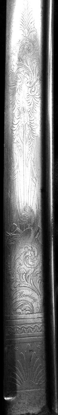 Ich habe die Klinge eines netten Schleswig-Holstein Offiziers m1848 erworben. Ich glaube, dass es eine private Kaufklinge ist, da es alle Regimentsstempel ermangelt. Die Blattradierung umfaßt die Wörter „F.G. Morin in Hamburg“, wem setze ich war ein Einzelhändler voraus. Das Blatt wird mit Blumensprays und Standplätzen der Arme geätzt. Die Scheide ist mit Messingaufhebungringen Stahl.