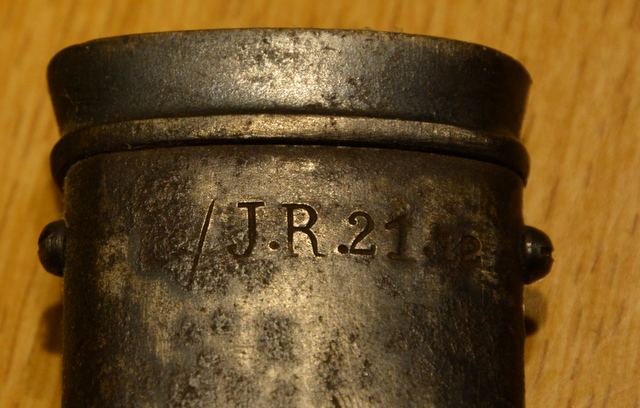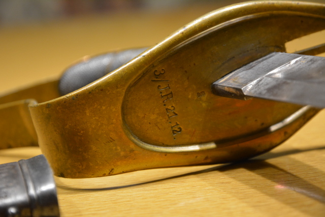 - Buchstaben- und Zahlenstempel: Auf dem Griff (Seite der Schneide) und Scheide eine Nummerierung, (vermutlich Regiment) "3./J.R.21.12." (Auf der Scheide ist das 3. nicht mehr lesbar)