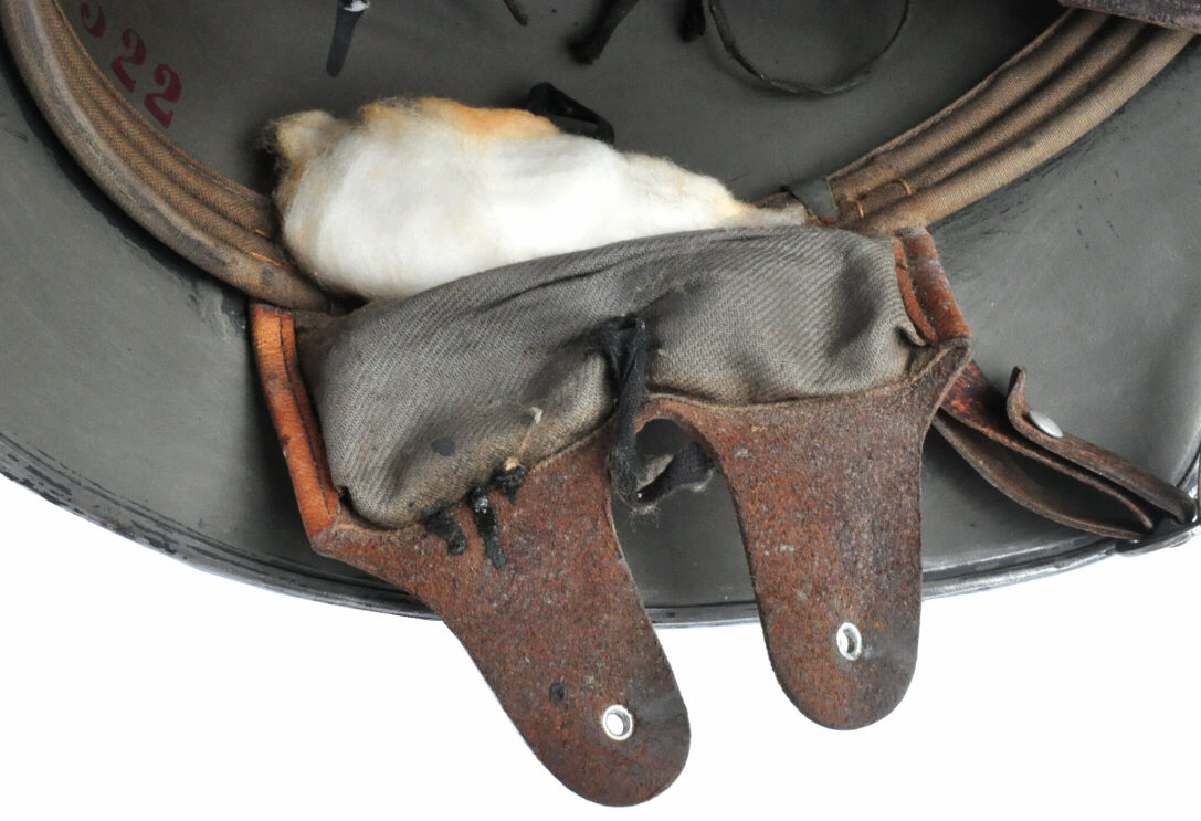 hier ein Stahlhelm M1918 der ersten Ausführung, Kinnriemen mit Dorn und direkt