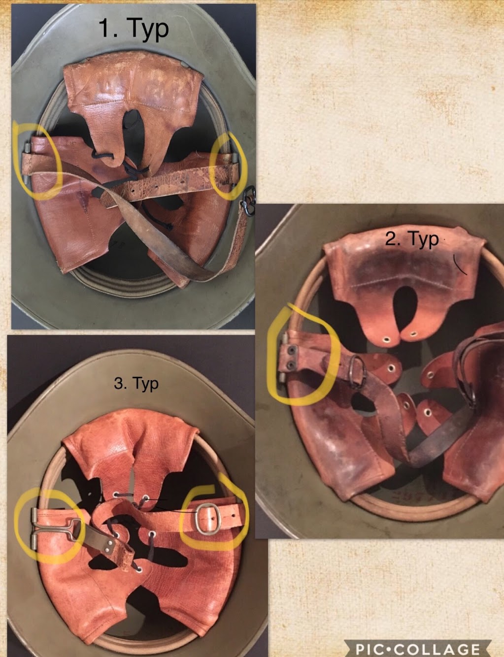 vernäht am Helm. Da die 3 Lederlaschen noch über keine Ösen verfügen, tippe