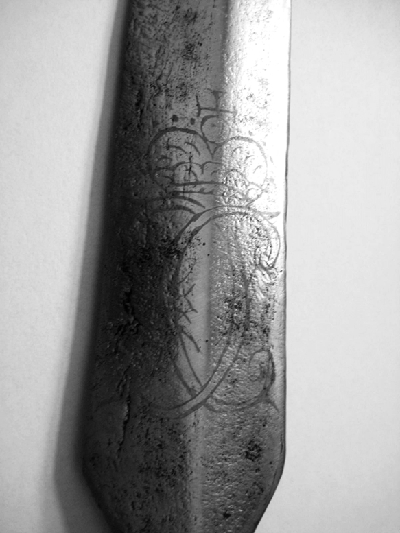 Auf der Klinge ist noch beidseitig das Monogramm von Herzog Carl Eugen von Württemberg 1737–1793 unter dem Herzogshut noch schwach zu erkennen. Ich habe die Bilder mit einem Fotoprogramm bearbeitet, damit man die Chiffre auf den Bildern auch einigermaßen sehen kann.