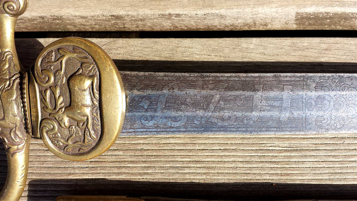 So sind auf diesem Hirschfänger zeitgenössische Jagdszenenen mit Wild und Hunden dargestellt.