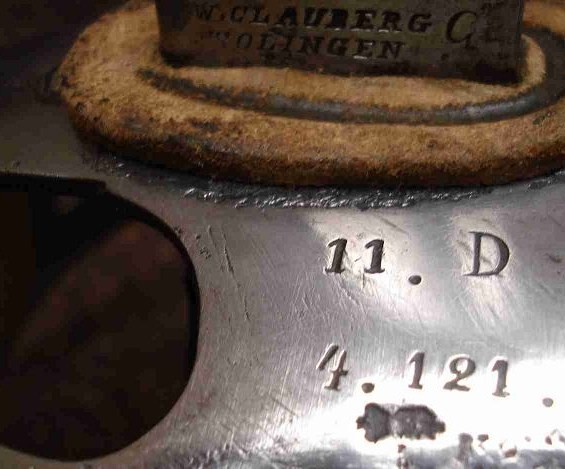 Hersteller ist W.Clauberg Solingen und ein "G" als Kennzeichnung dafür, dass die Klinge aus Gußstahl ist