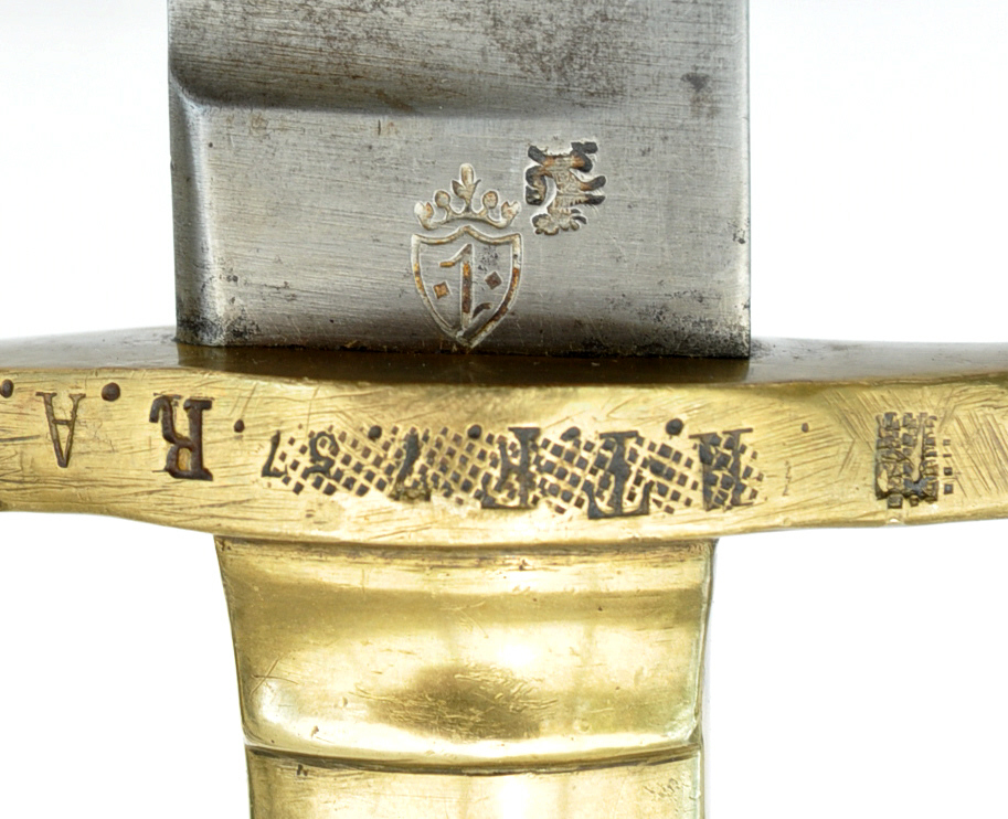 Normalerweise würde man bei deutschen Blankwaffen den Stempel im Bereich des Klingenorts, also eher auf der Fehlschärfe erwarten. Daß nun hier dies im Bereich der Klingenstärke und noch dazu bei einer vollen Klinge erfolgte, ist zumindest recht ungewöhnlich und