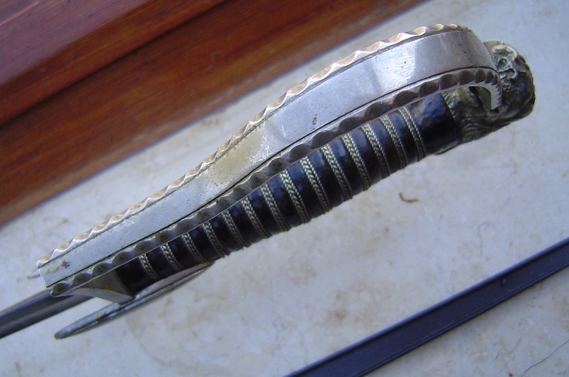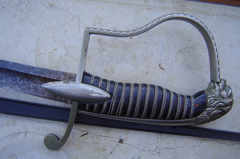 hab diesen mMn Husaren Off. Säbel erstanden. Der Griff ist aus versilbertem Messing, Ledergriff mit Silberdrahtwicklung, unter dem Griffbügel ist schlecht sichtbar der Hersteller zu erkennen, sieht nach E&W.A. aus!?