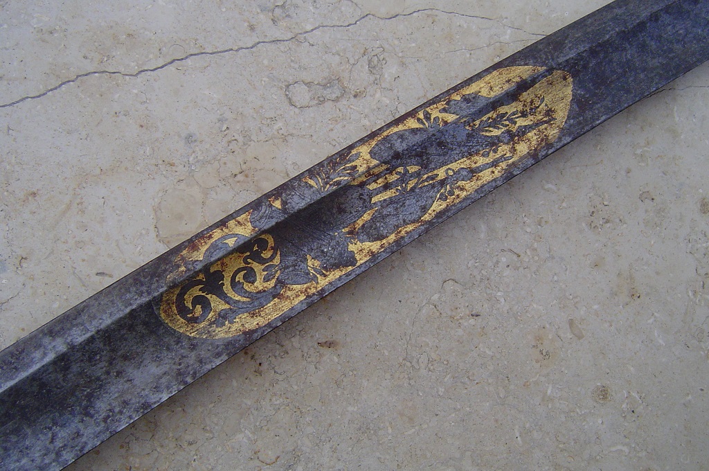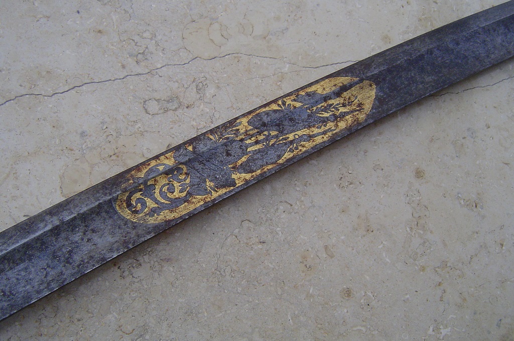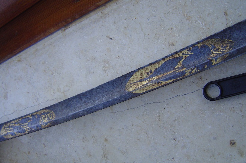 Anbei noch ein paar Bilder der Ätzung bzw. Spitze, leider ist die Klinge recht Flugrostig so dass man nicht allzu viel erkennen kann!