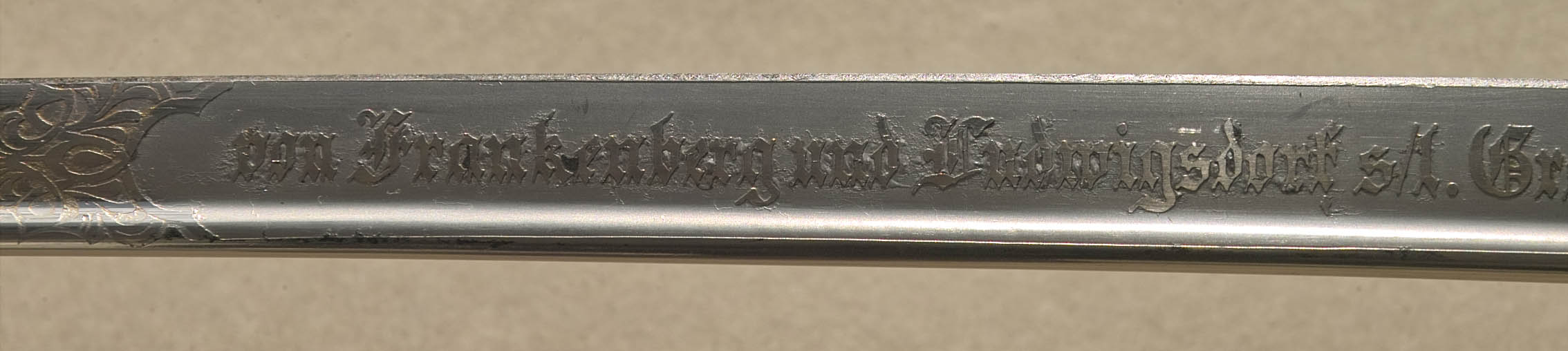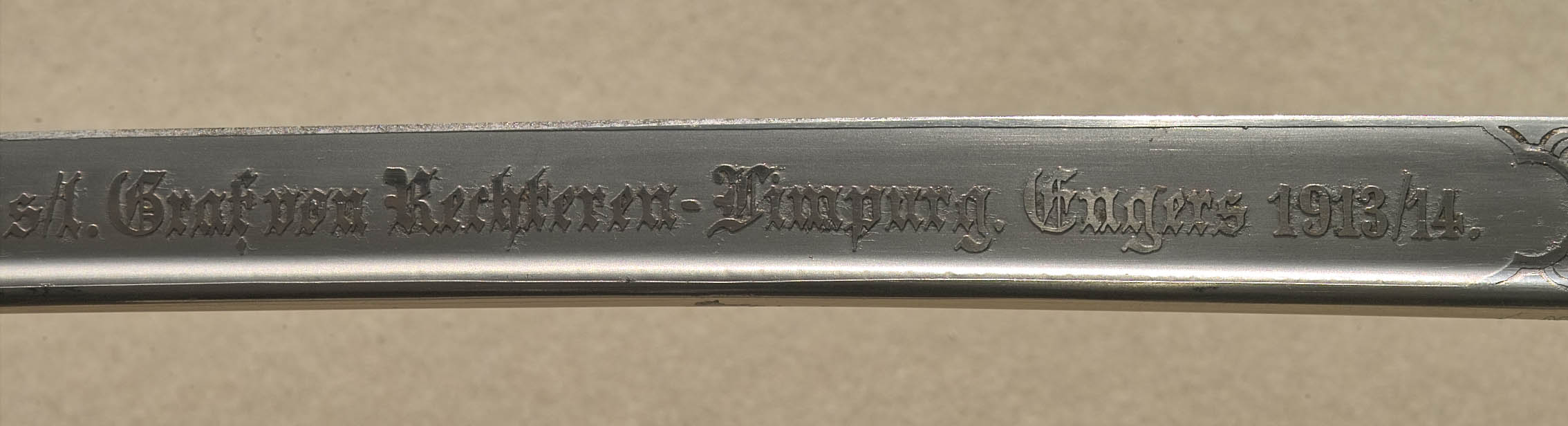 Geschenkt bekam er diesen Säbel von einem Herrn von Frankenberg ud Ludwigsdorf. Dieser ist leider nicht so einfach genauer zu bestimmen, da es in der 1914er Rangliste zwar nur einen Grafen von Rechteren-Limpurg, dafür aber 11 von Frankenberg und Ludwigsdorf gibt, die vom Leutnant bis zum Generalmajor reichen.