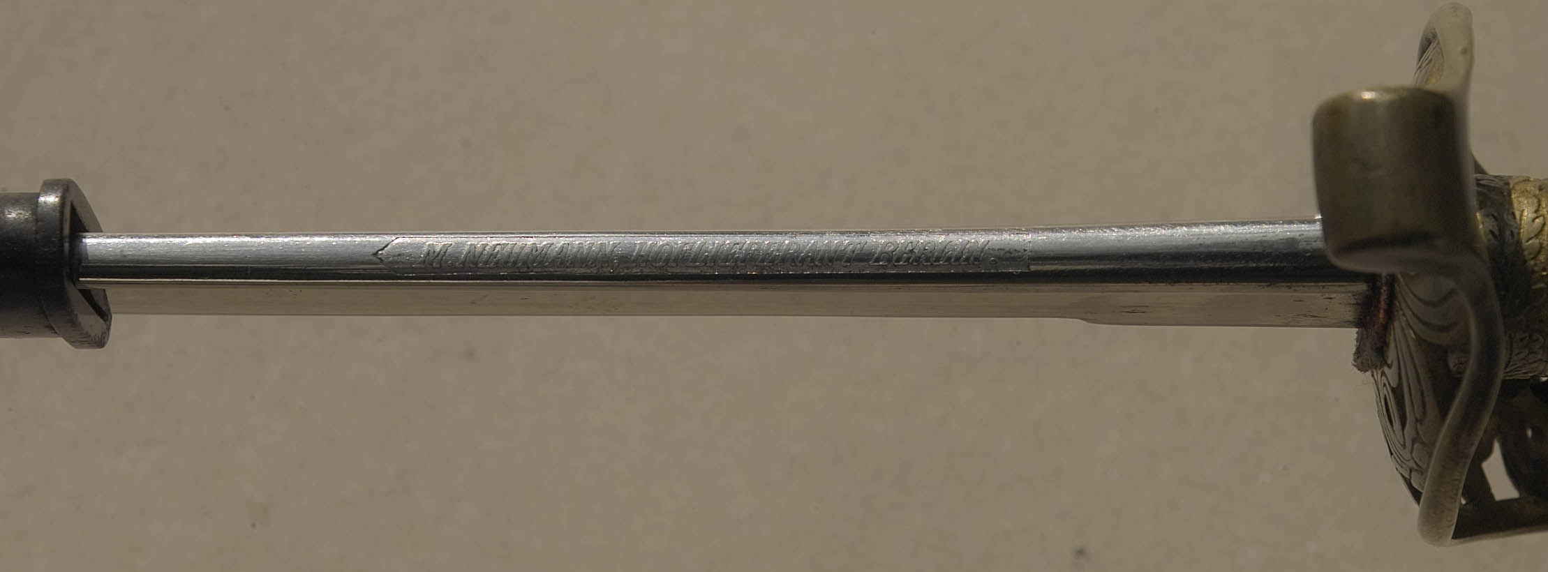 Die Blankwaffe hat eine Steckrückenklinge mit Schörr und trägt leider keinen Hersteller, aber als Händler findet sich auf dem Klingenrücken die Signatur »M.Neumann, Hoflieferant, Berlin«