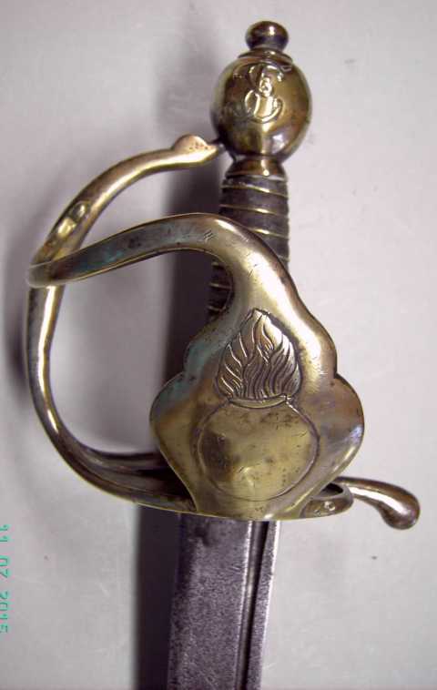 Gesamtlänge 790mm, Klingenlänge 640mm, Klingenbreite 30mm, Pfeilhöhe 21mm, Gewicht 738g. An der Quartseite schöne Darstellung eines Grenadiers mit entsprechender Mütze, Granate und Gewehr, terzseitig das bekrönte Monogramm "EF" über "