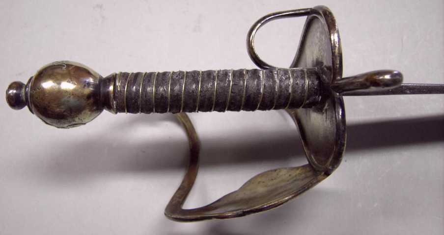Ernst Friedrich I. 1714-1724 zuzuordnen sein. Das gegossene Messinggefäß mit Daumenring zeigt im Knöchelschild eine Granate und am Knauf terzseitig das ligierte Monogramm "EF" und quartseitig die Chiffre "N°3". Die Klinge ist 32mm breit und 670mm lang. Die Pfeilhöhe beträgt 35mm.