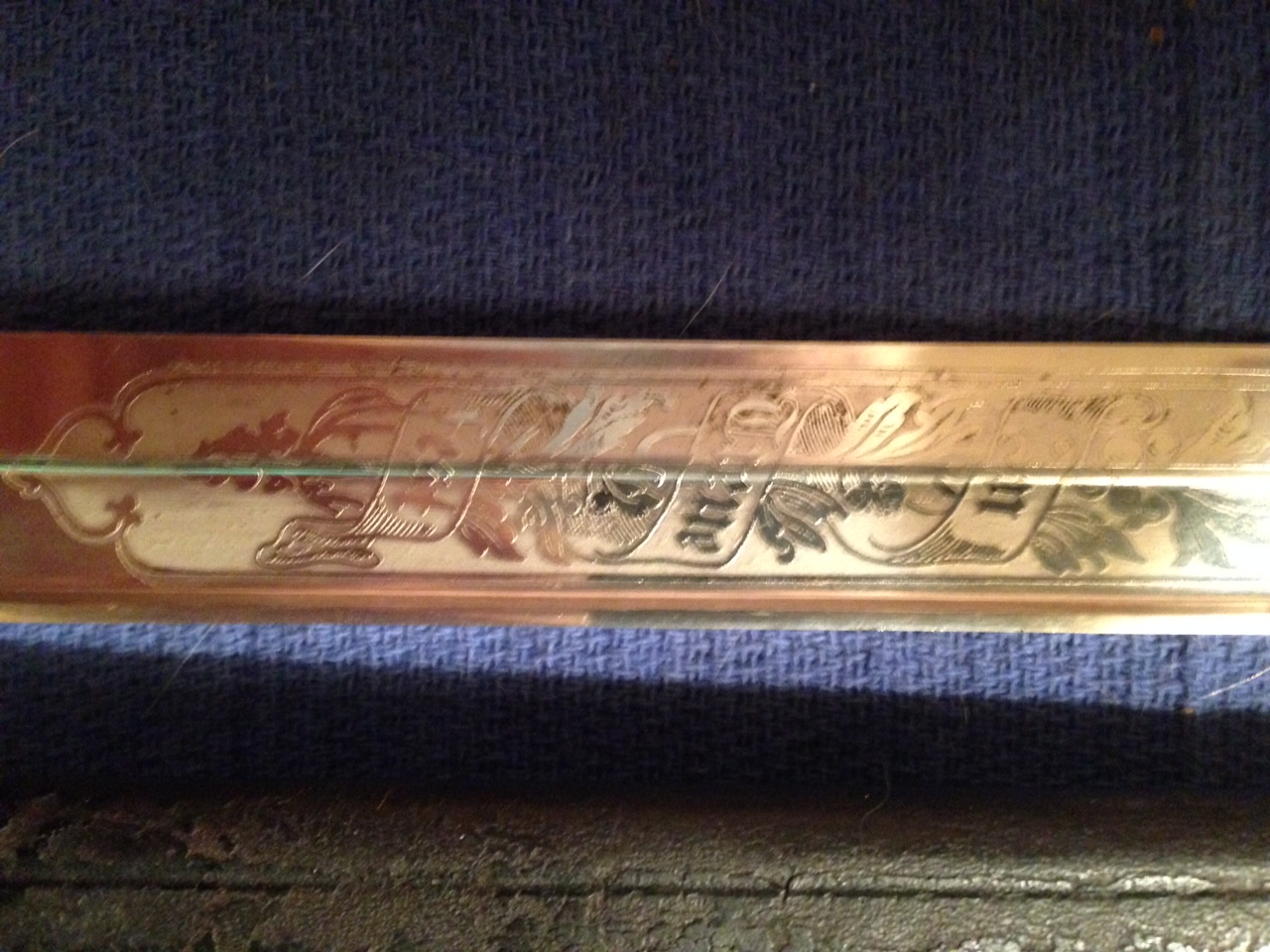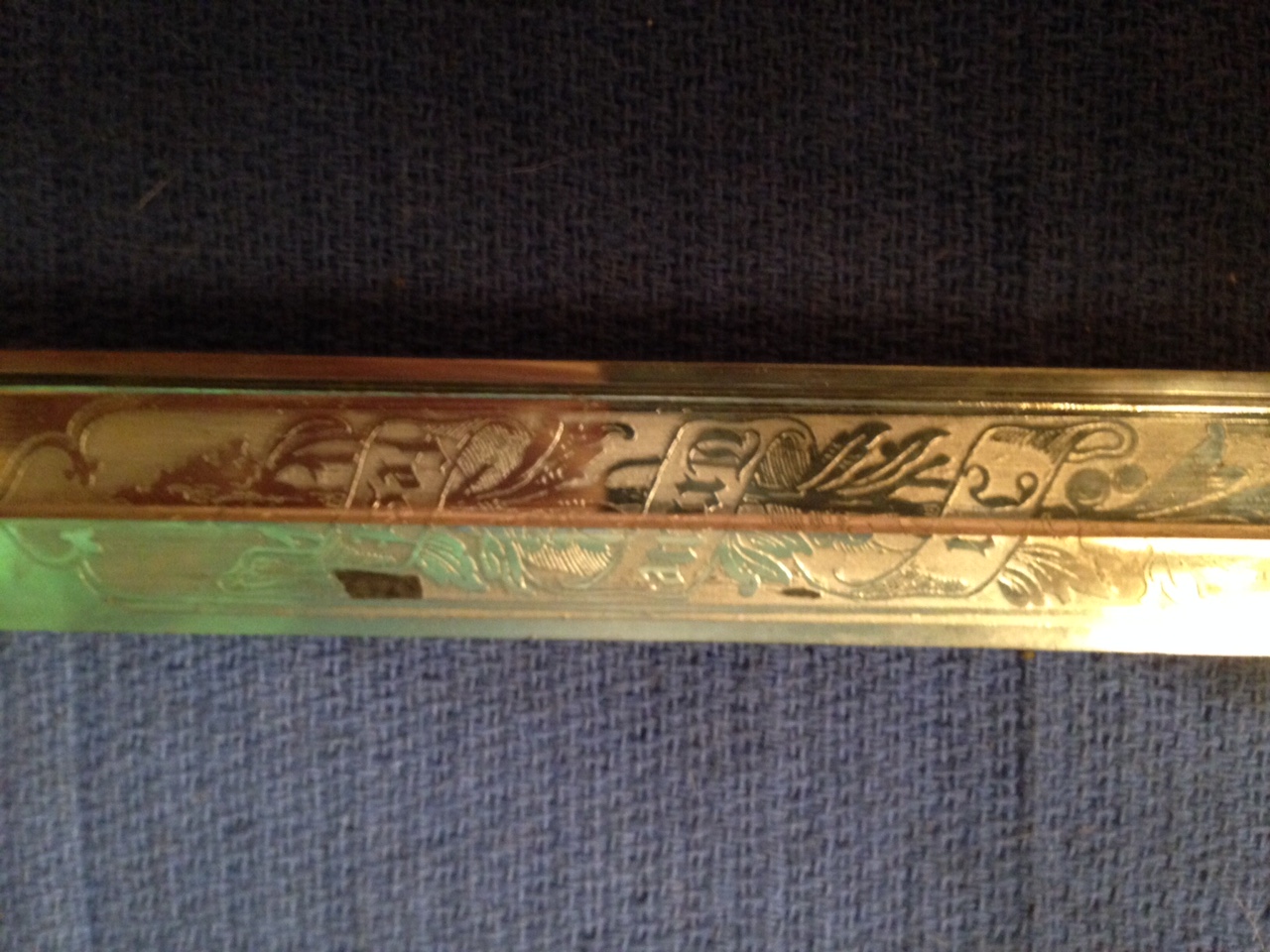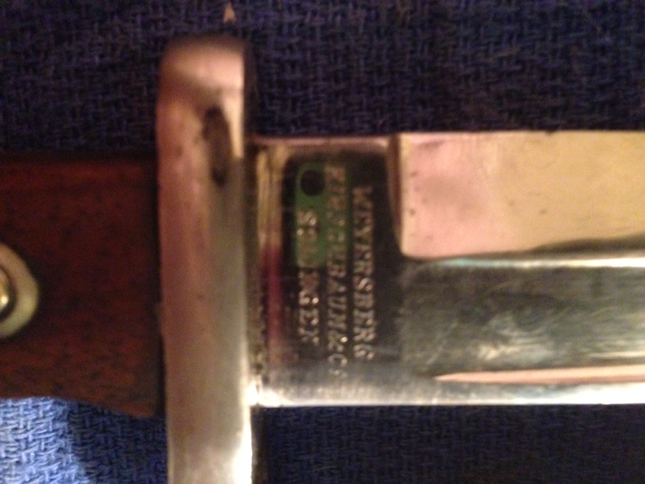 Hersteller: WK&C. Vernickellet, aetz mit Bayrisches Motto; "IN TREUE FEST" am beiden siten der Klinge. Nussbaum Holtz Griffsutuecken....Verkaufer ist: "J A Hirteis-Fuerth", am rucken der Klinge.