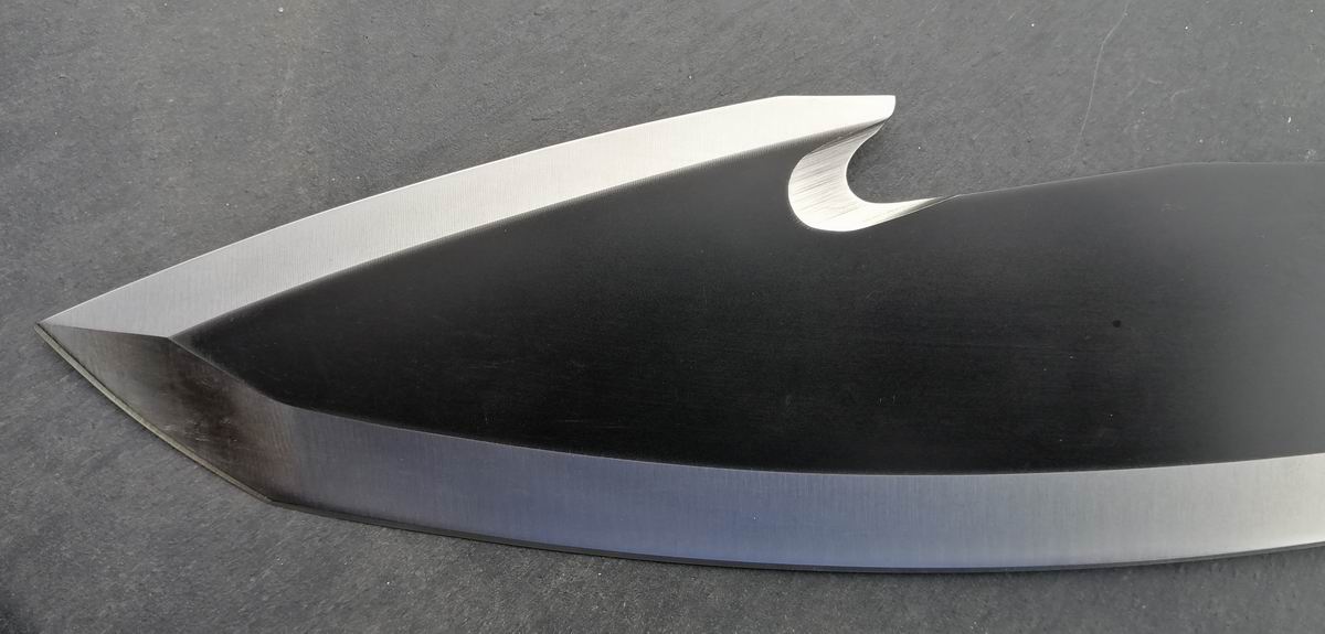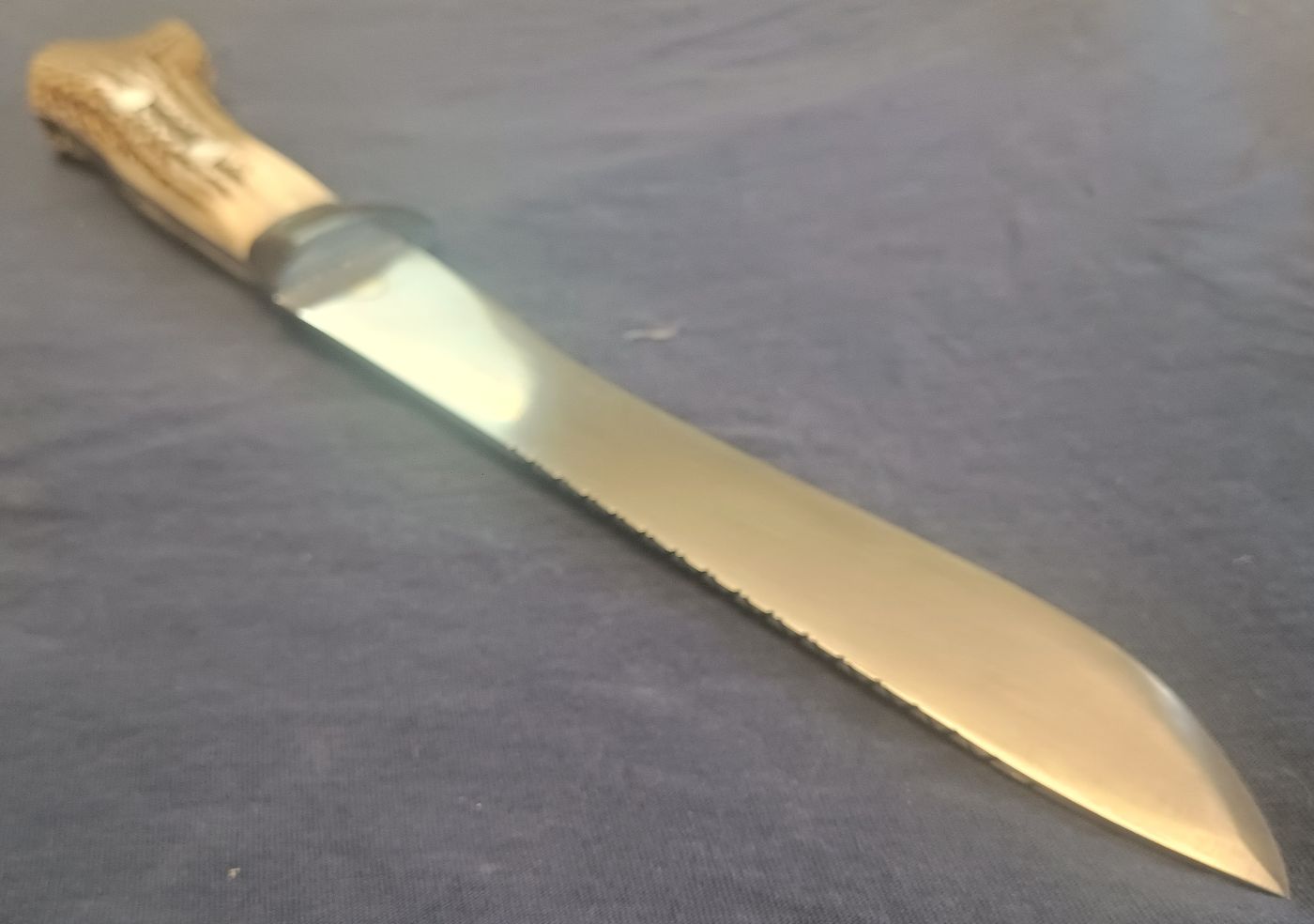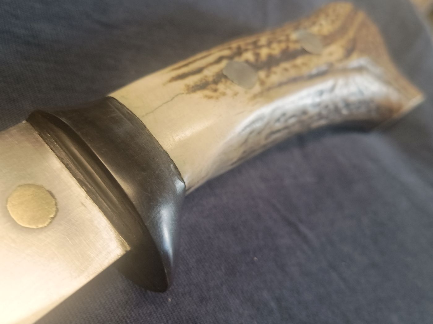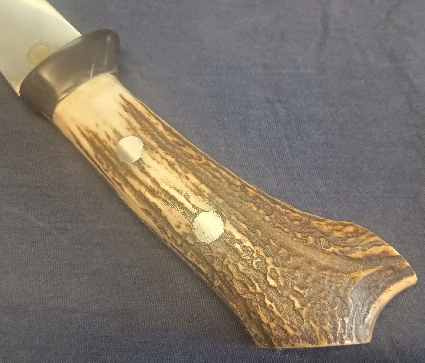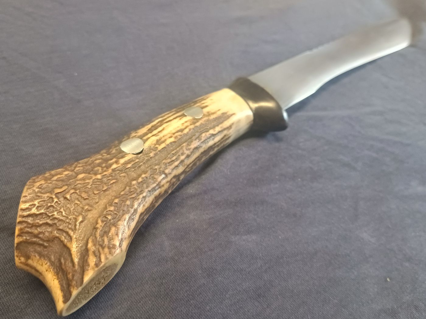 Ja, es hat etwas von einem Waidblatt. Das Geweih ist übrigens Plan B. Ursprünglich sollte der Griff einen Rahmen aus Messing bekommen und schöne Griffschalen aus Holz. Es war auch schon fast fertig und dann kam der eine letzte Schlag auf die Niete, den man am Ende immer zuviel macht. :( Einige kennen das aus Erfahrung. :D