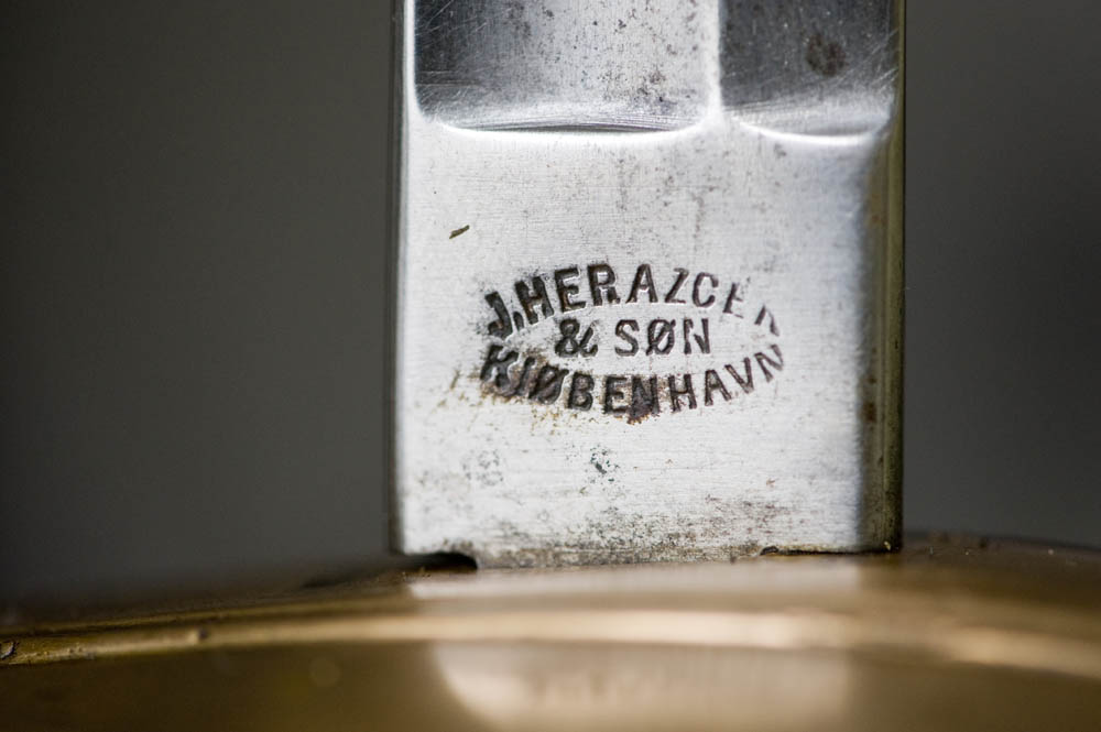 wie der Zufall es wollte, kann ich jetzt selbst das "Rätsel" auflösen, bzw. mit einem Namen aufwarten. Meine neueste Errungenschaft besitzt am Schleppblech den gleichen Stempel, diesmal etwas leserlicher. Und noch besser: Auf der Klinge ist der Name zusätzlich ganz deutlich zu erkennen: J. Herazcek & Søn Kjøbenhavn. Also wohl doch Dänisch, trotz des "irreführenden" tschechischen Namens :)