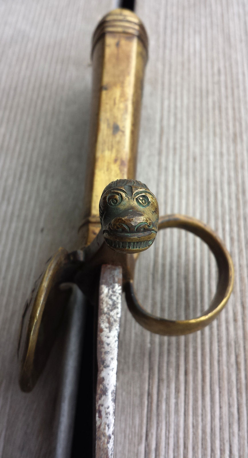 Messinggefäß mit Daumenring, rundem, in einer Parierstange mit Löwekopf auslaufenden Griffbügel und nach unten gebogenem Stichblatt, darauf Signet: "F", gespiegelt, und Hammer und Schlägel.