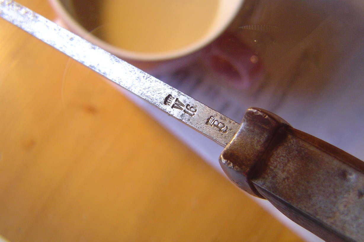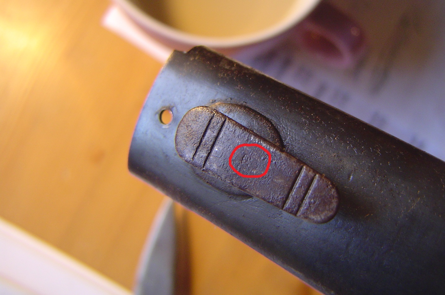 Die Scheide weißt diverse Auffälligkeiten auf! Der Mundblecheinsatz hat keine Plattfedern, die würden in den schmalen, schlanken Scheidenkörper auch nicht rein passen. Es sind 2 Löcher zur Befestigung des Mundbleches vorhanden, der Einsatz hat jedoch nur ein Loch! Am Tragehacken ist schwach eine Abnahme zu erkennen. Truppenstempel ist hier M.G.A.3.13 Maschinen Gewehr Abteilung 3 in Saarburg.