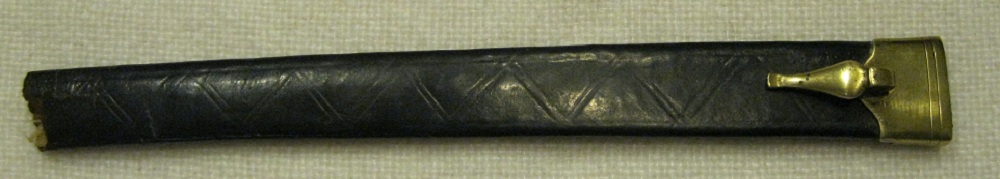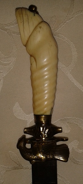 Der Griff dieser Jagdplaute dürfte aus Elfenbein sein und hat die Form eines Hirschlaufs. Sie ist messingmontiert und auch sie hat auf der Klinge beidseitig eine Panduren Figur. Darunter ist relativ klein der Schriftzug V.PANDUR erkennbar. Die Spitze ist im Klingenrücken angeordnet. Das Stichblatt in Vogelform stellt einen Auerhahn dar. Die Parierstangenenden sind leider in früherer Zeit abgebrochen beziehungsweise sie wurden abgenommen. Die Lederscheide ist in gutem Zustand und könnte eventuell etwas jünger sein.