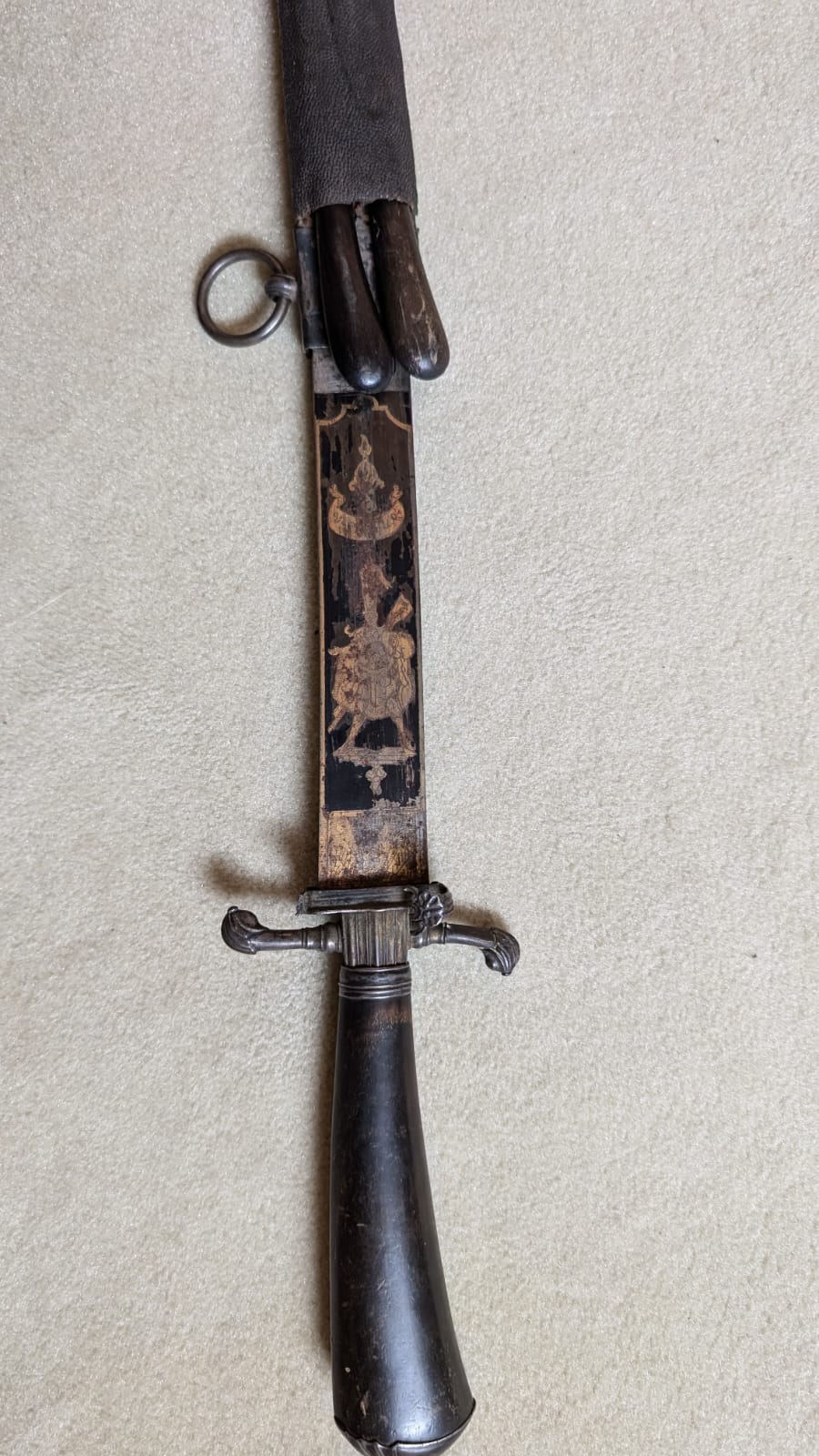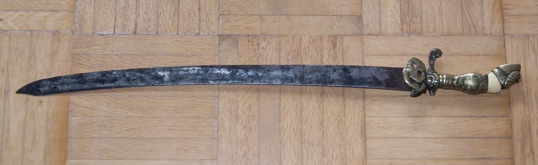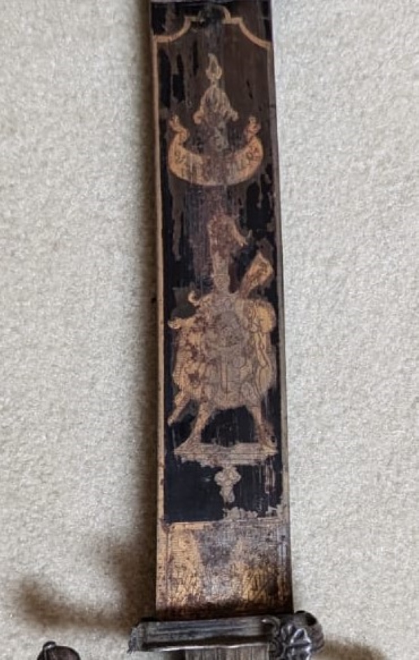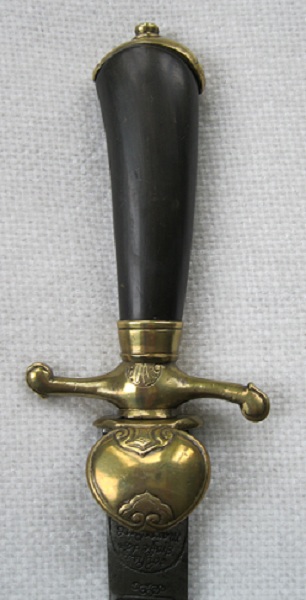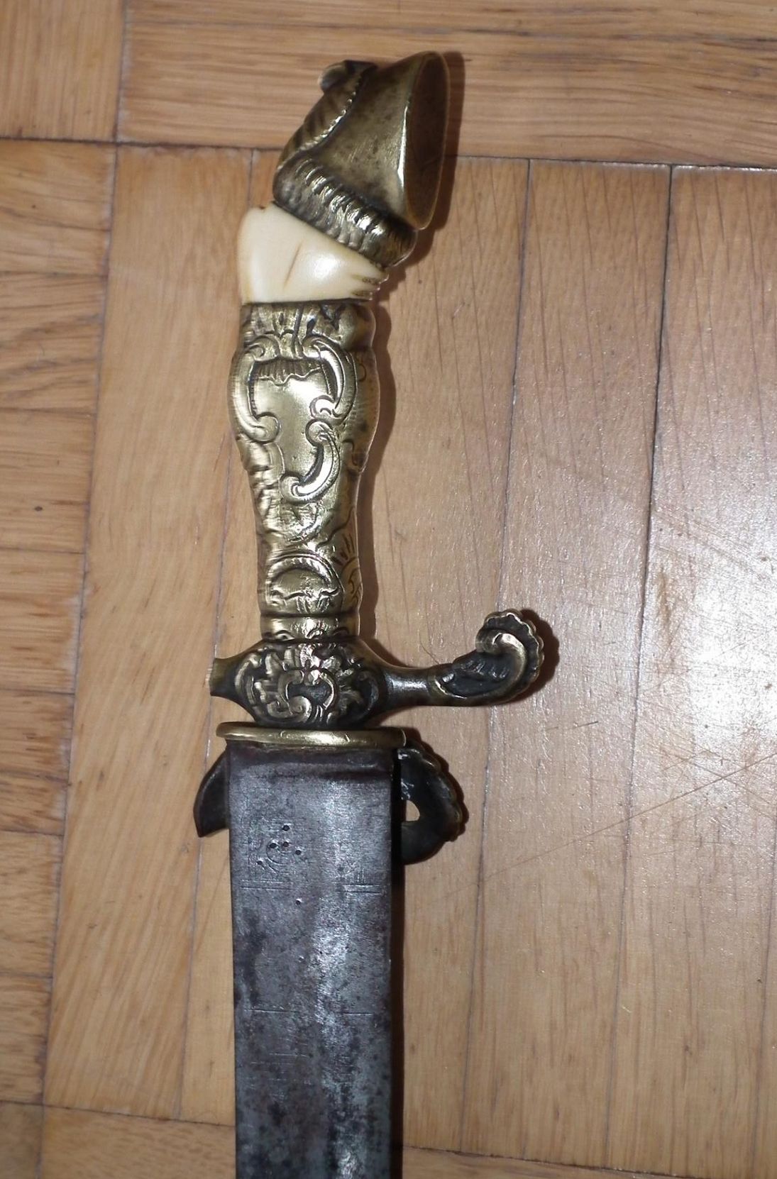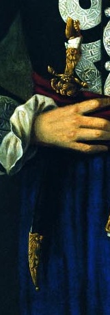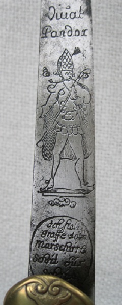 In der Tat, eine verblüffende Ähnlichkeit mit dem Stück auf dem Gemälde. Außer dem auffälligen mehrteiligen Griff der in einem Hirschlauf endet sind hier auch die Tatzenkreuze auf der Klinge erkennbar. Diese sieht man auch des Öfteren in Verbindung mit der Pandurendarstellung.