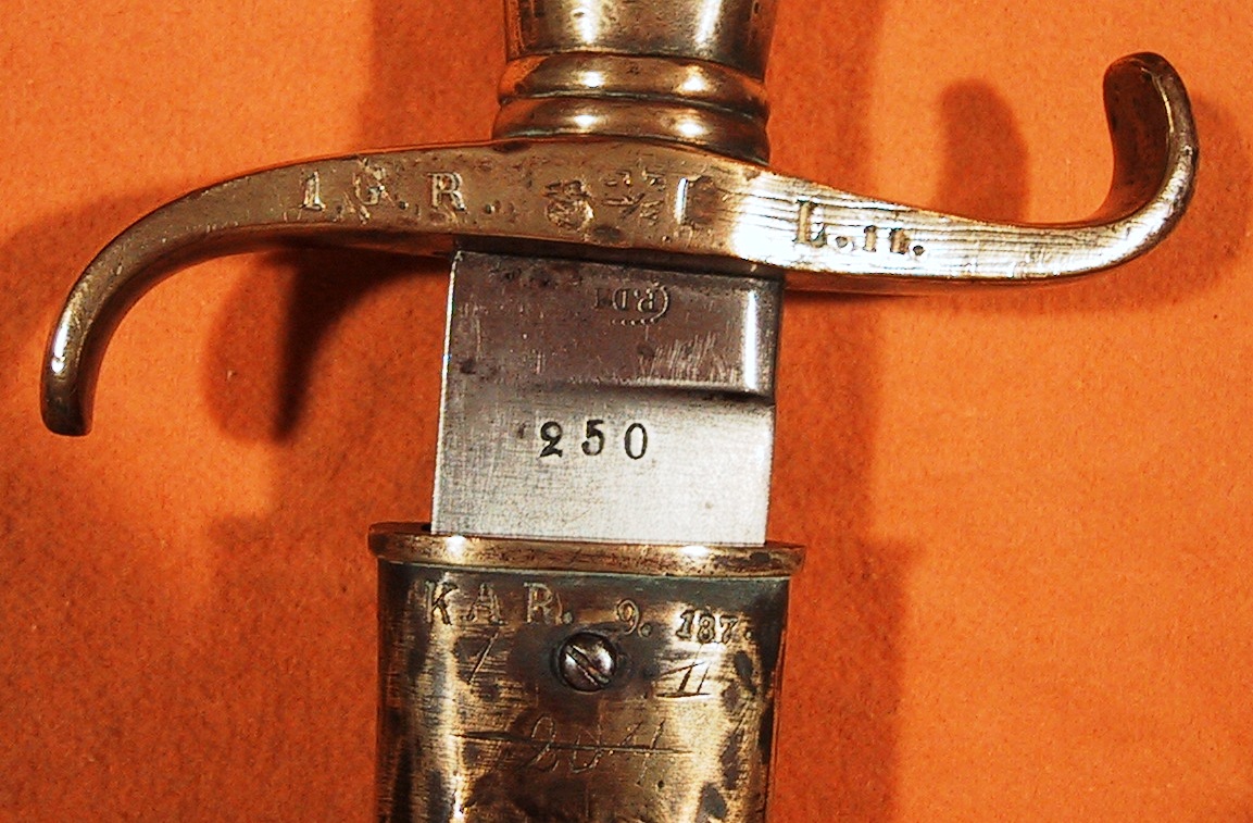 Das Seitengewehr selber ist auf der Innenseite des Kreuzstücks 1.G.R.L.11 gestempelt. Der Stempel ist unterbrochen durch eine überkronte FW61 Punze und eine kleinere überkronte W Punze darunter. Der Truppenstempel lässt sich auflösen als:
