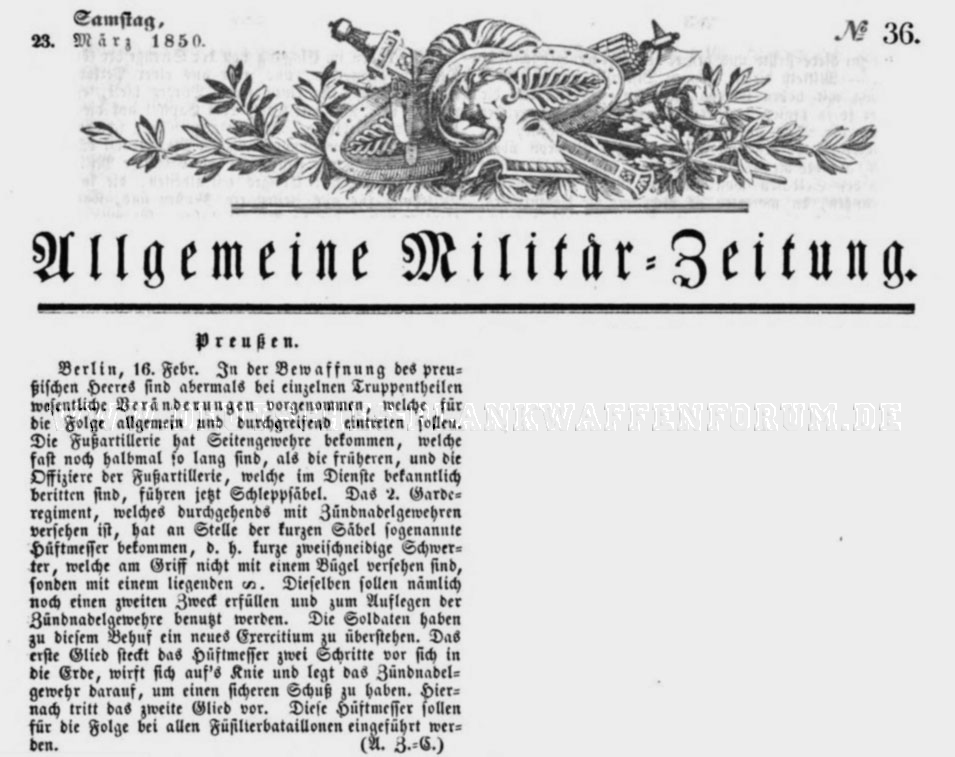Zum preußischen Infanterie- und Artillerie-Faschinenmesser M1852 habe ich in der AMZ vom 23.März 1850 eine interessante Textstelle gefunden: