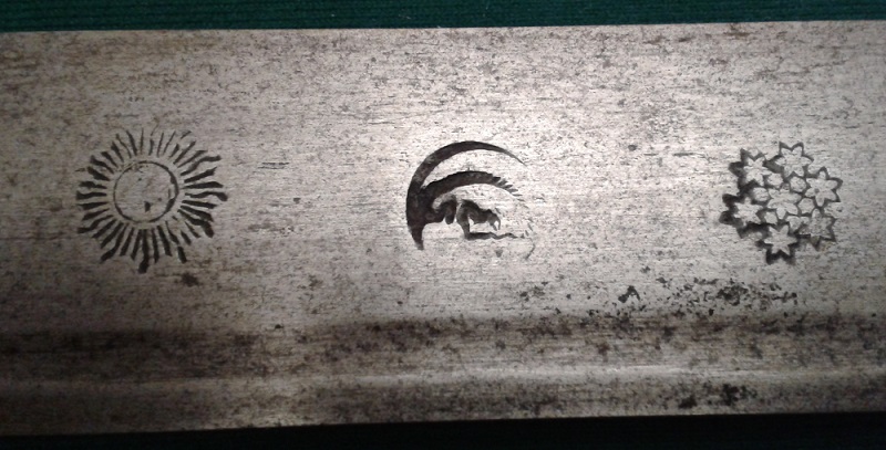 Grund hierfür waren die Schmiedemarken welche mich neugierig machten. Dies sind Sonne, Mond und Sterne und dazu noch zwei Anker mit Buchstaben. Hierbei handelt es sich oben um ein J. und ein C., unten sind die Buchstaben leider verputzt. Lediglich der obere Teil ist hier noch erkennbar. Links kämen dann B, D, P und R in Frage, rechts wären es C, G oder S. Diese Zeichen machen auf mich einen europäischen Eindruck, wobei die Gestirne eigentlich typisch für ältere Klingen wären, vielleicht so 17. Jahrhundert, die Ankermarke wiederum erinnert eher an das 19. Jahrhundert.