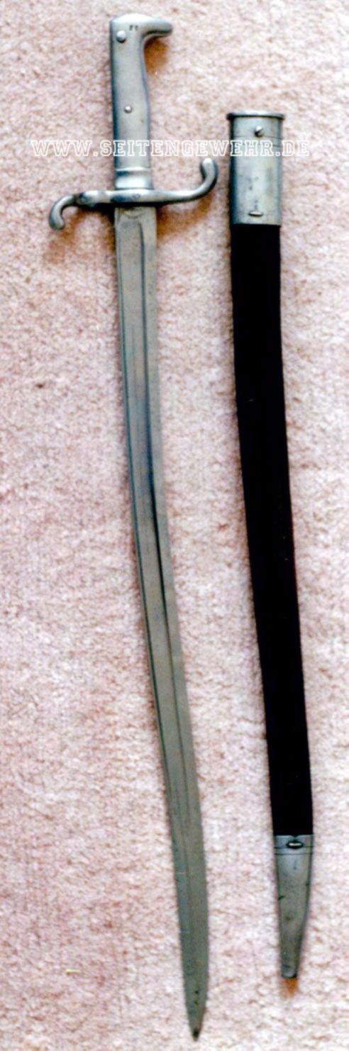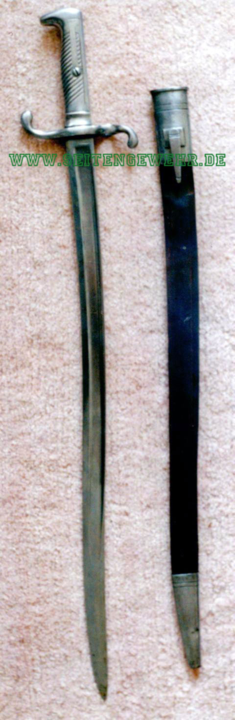 Das dazugehörige Seitengewehr taucht als Realstück ebenso wie auch in der Literatur nur recht selten auf. Hergestellt wird das Haubajonett 1876 von der Solinger Firma Ernst & Hermann Neuhaus. Abweichend von den üblichen 71er Seitengewehren ist hierbei auch das Griffstück aus Eisen gefertigt. Die Klinge ähnelt hingegen der des französischen Mle 1866. Versorgt wird die Waffe in einer schwarzen Lederscheide mit eisernen Beschlägen. Die dazu abgebildeten Seitengewehrtaschen dürften original nicht zu den Waffen gehören.