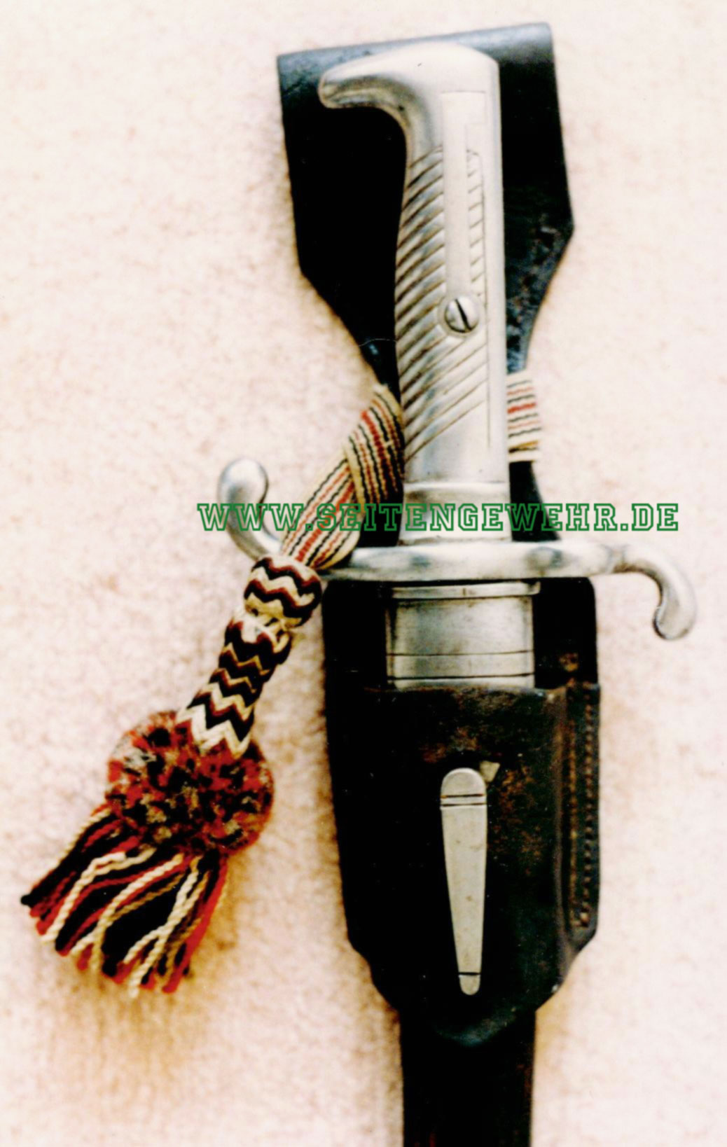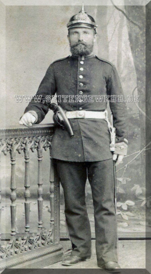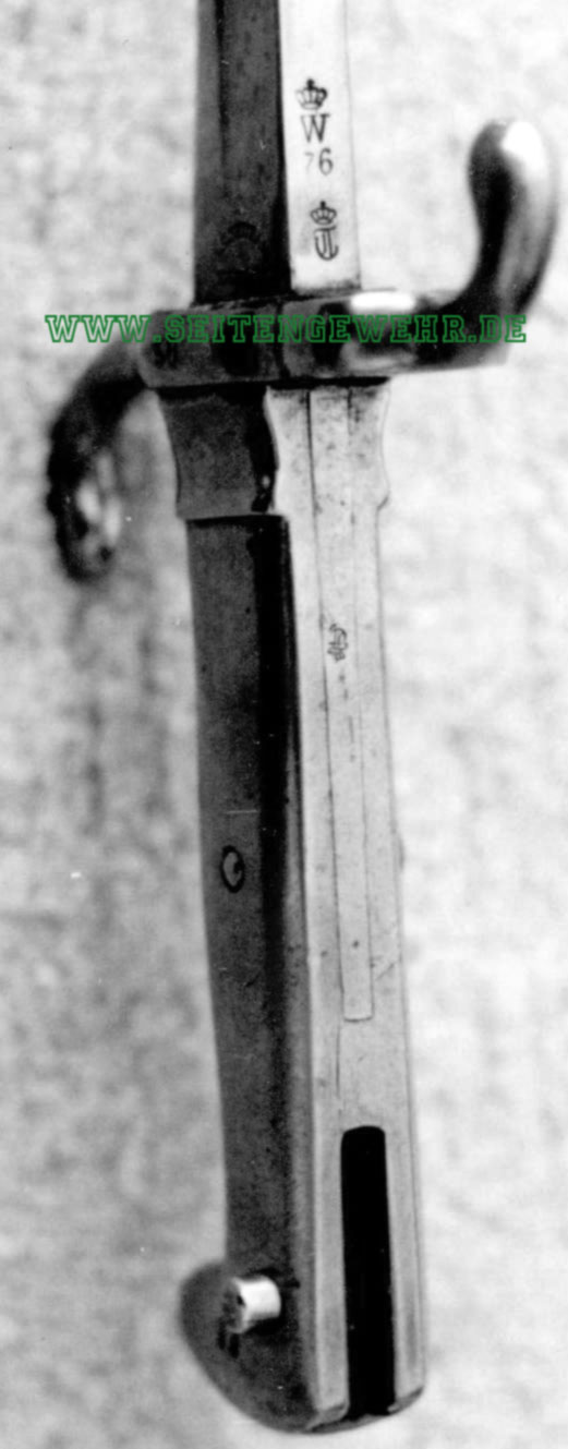 Das dazugehörige Seitengewehr taucht als Realstück ebenso wie auch in der Literatur nur recht selten auf. Hergestellt wird das Haubajonett 1876 von der Solinger Firma Ernst & Hermann Neuhaus. Abweichend von den üblichen 71er Seitengewehren ist hierbei auch das Griffstück aus Eisen gefertigt. Die Klinge ähnelt hingegen der des französischen Mle 1866. Versorgt wird die Waffe in einer schwarzen Lederscheide mit eisernen Beschlägen. Die dazu abgebildeten Seitengewehrtaschen dürften original nicht zu den Waffen gehören.