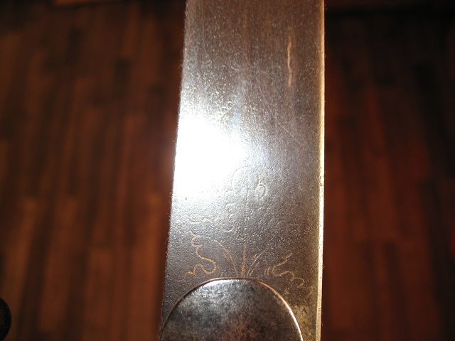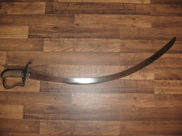 Es handelt sich hierbei um einen Säbel für Infanterie-Offiziere mit gekrümmter Klinge. Eisernes Bügelgefäss mit Faustriemen-Durchbruch. Mit Fischhaut überzogener Griff, die Drahtumwicklung ist noch vollständig. Die Klinge ist ca. bis zur Hälfte geätzt mit militärischen Trophäen, Blattwerk und dem Monogram von King George III. (1760-1820). Auf dem Blattwerk (siehe Bild) sind noch leichte Reste der Vergoldung zu erkennen. Auf dem Säbel ist kein Herstellername oder ähnliches zu finden. Die dazugehörige Scheide fehlt leider.