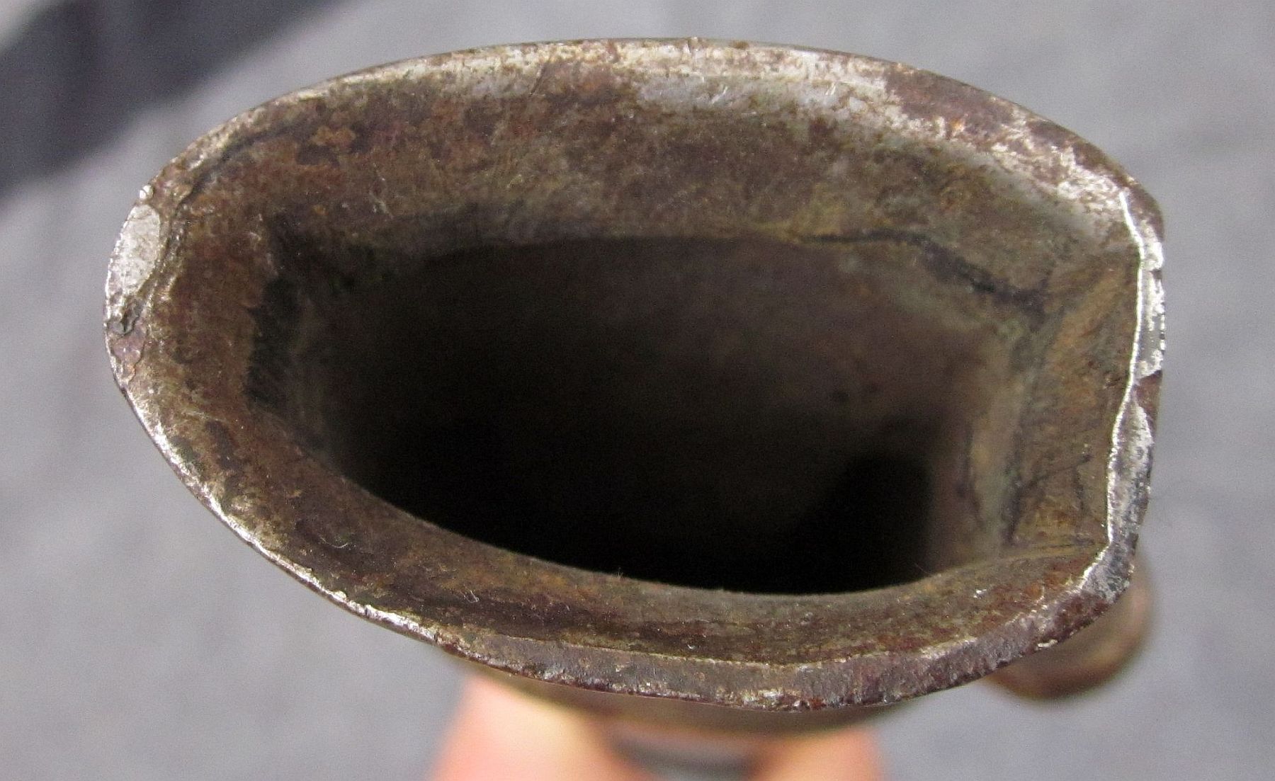Der obere Ring fehlt, es ist keine Öse auf der Quaertseite vorhanden. Das Mundblech ist gewölbt, der Scheidenrücken ist abgeflacht.Quartseitig ist der Name Mitter gestempelt, die Buchstabe sind etwa 2mm hoch.