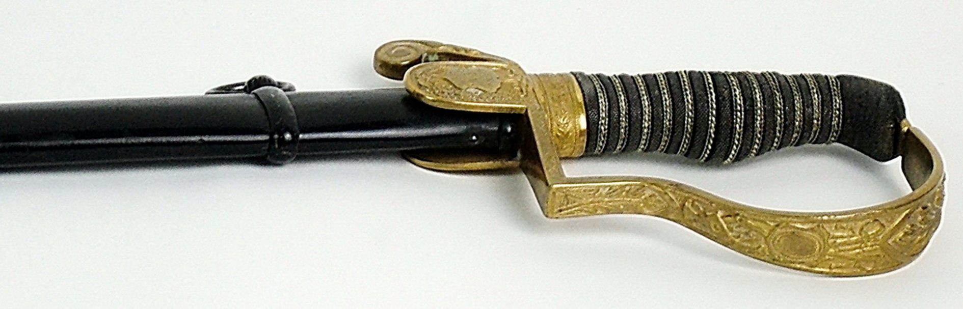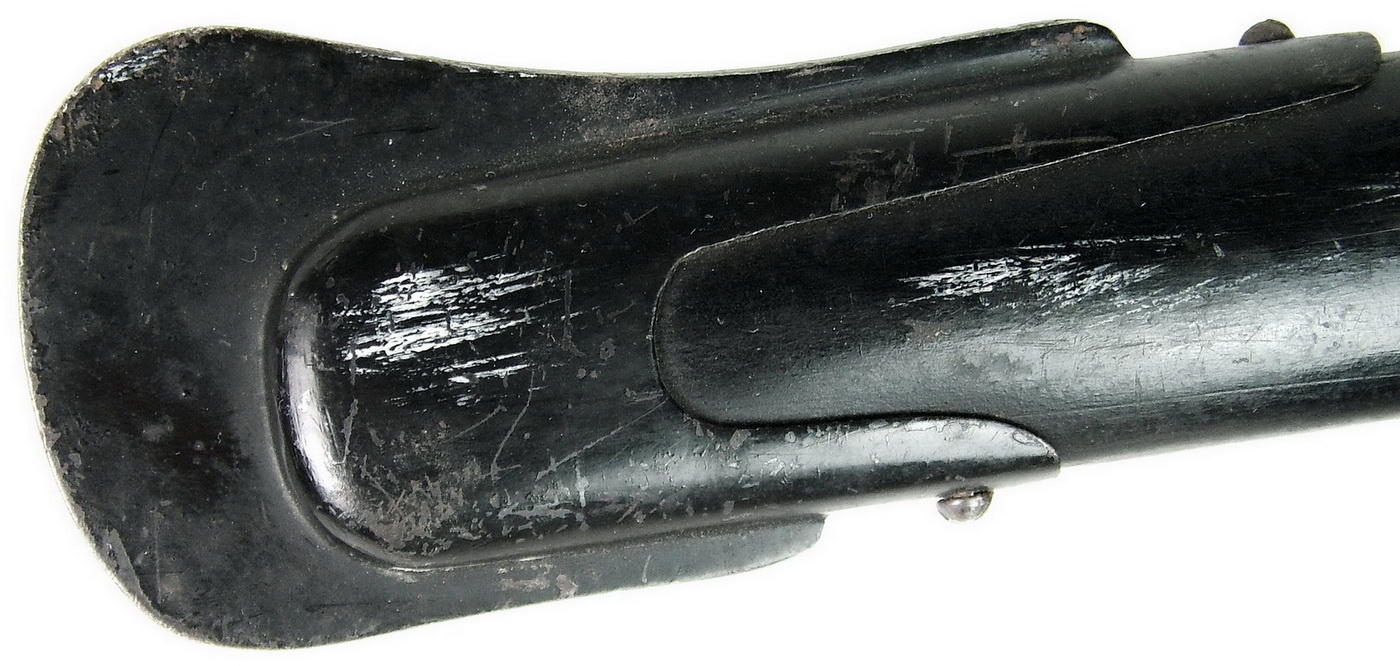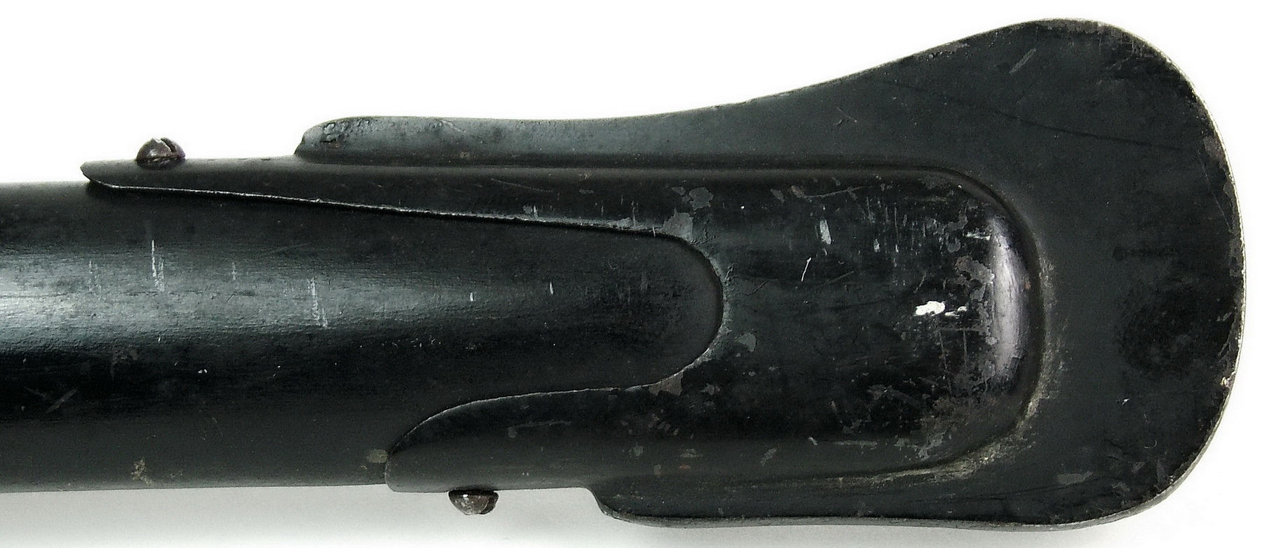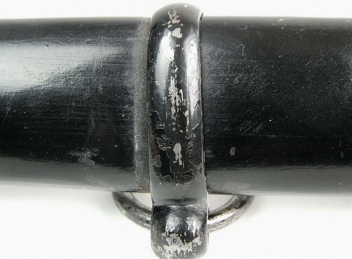 Der Scheidenring wurde vermutlich nur aufgeklebt. Auf den Bildern weiter unten sieht man, wie der Ring heute auf der Scheide verschoben werden kann. (fotografiert beide Male mit der gleichen Einstellung). Scheidenmund, Scheidenring und Schlagstück aus Eisen.