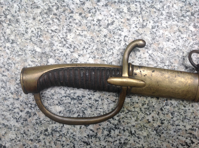 Gefäß und Scheide sind Messing. Klinge ist eine Rückenklinge 3,4 cm breit mit einer breiten( üblichen Hohlkehle) Keine Marken und keine Abnahmen auf der Klinge oder Griff. Alte gwewachsene Patina und original vernietet. Also ein absolut unberührtes Stück. Mehr ist leider nicht zu sagen.