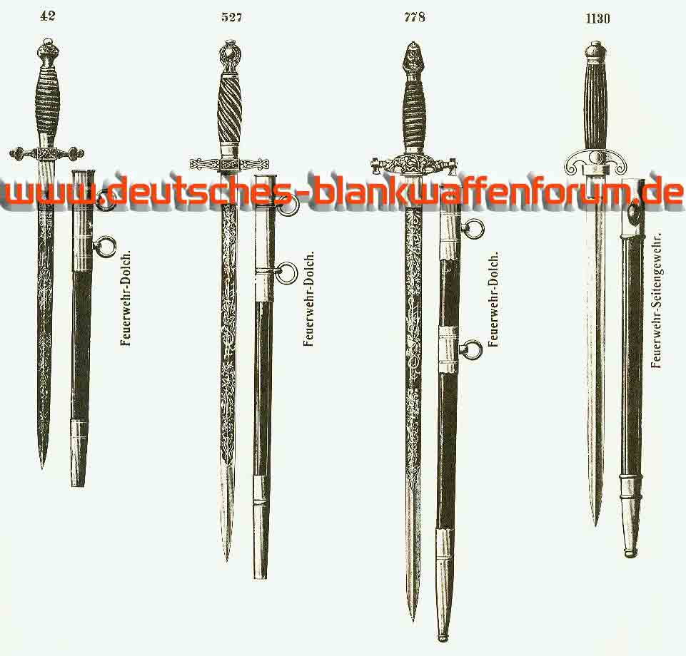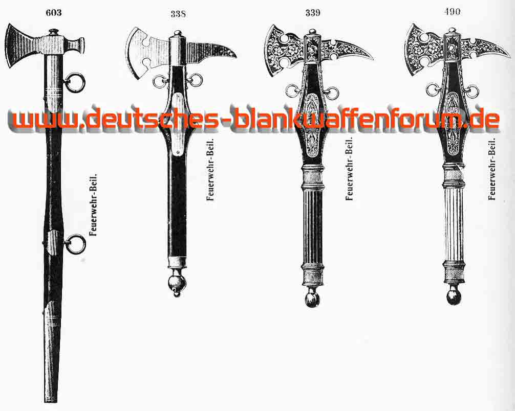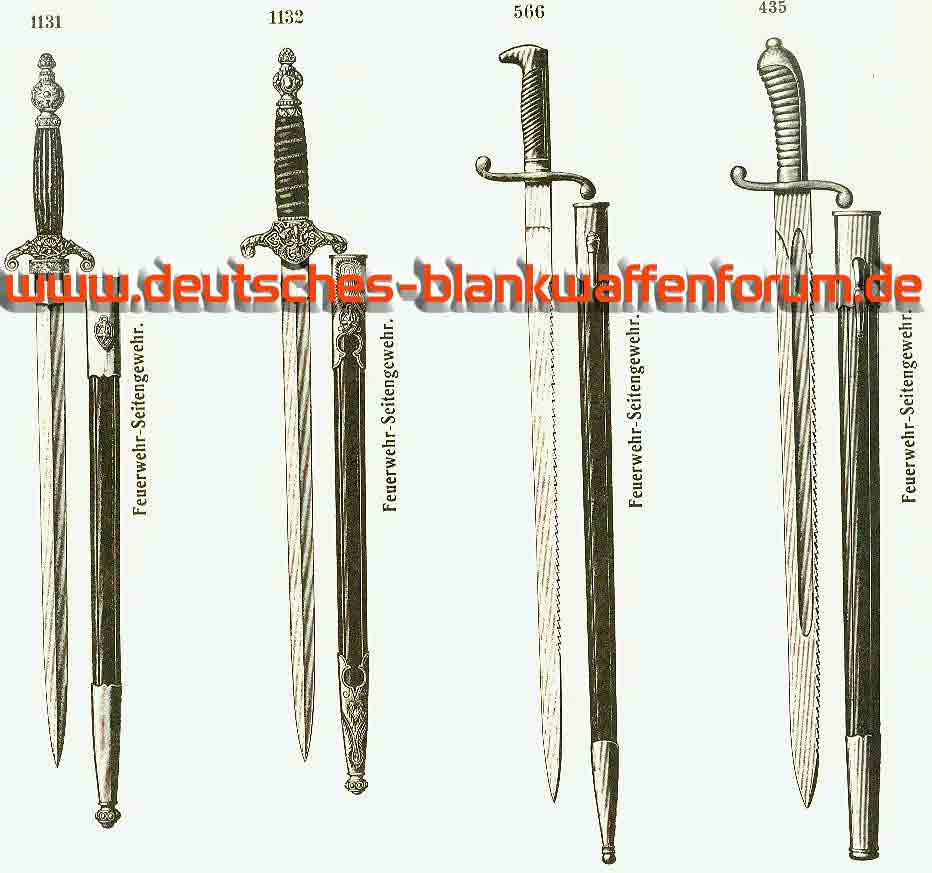 Die diversen Feuerwehren waren auch für viele Blankwaffenhersteller eine zahlungskräftige Kundschaft. So ist es nicht weiter verwunderlich, daß fast alle diese Firmen auch verschieden Seitengewehre und Beile in ihrem Sortiment anboten. Teilweise reglementiert, aber wie auch bei den militärischen Seitengewehren entschied im Endeffekt der Geldbeutel des Käufers über Art und Weise der Ausstattung. Als Beispiel hier Auszüge aus dem Katalog der Firma Eickhorn in Solingen um 1906.