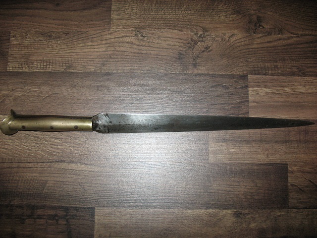Den Dolch erwarb ich in einem Antiquitätengeschäft in Bulgarien. Der Dolch stand zusammen mit ein paar stark verrosteten deutschen WK 1 Bajonetten in einem Kübel in der hintersten Ecke des Geschäfts. Die Bajonette waren leider nicht mehr sammelwürdig, also richtete ich mein Augenmerk auf den Dolch. Mir gefiel das der Dolch einen Yatagangriff hat, aber die Klinge nicht wie beim Yatagan leicht gebogen ist. Da ich so etwas noch nie gesehen hatte und der Preis stimmte, kaufte ich den Dolch. Der Dolch hat auch ein gewisses Alter sowie Gebrauchsspuren, die dazugehörige Scheide fehlt leider. Hier noch ein kleiner Tipp für jene die vielleicht mal in Bulgarien Urlaub machen möchten und bei dieser Gelegenheit ein Antiquitätengeschäft besuchen. Ich habe in Bulgarien 4 Antiquitätengeschäfte besucht, und ich meine nicht diese an belebten Touristenstraßen/orten, sondern jene abseits der Hauptstraßen. Jedes dieser Geschäfte verkaufte einen riesen Haufen gefälschter Militaria Gegenstände, hauptsächlich Deutsch 2. W.K., darunter auch viele Fantasieprodukte.