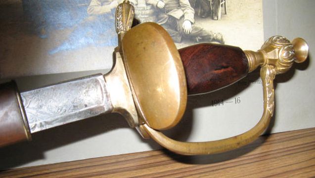 Das Griffholz könnte man etwas schlanker gestalten und dann mit einer Drahtwicklung versehen. Es gibt im Handel versilberten Draht mit einem Durchmesser von 0,8 mm. Wenn man den mit dem Akkuschrauber einmal rechtsrum und einen Zweiten linksrum verdrillt und sie dann gemeinsam eng um den Griff wickelt und fixiert, so wird das Ergebnis wahrscheinlich noch besser, zumindest originaler. Zwischen dem Stichblatt und der Klinge sollte sich bei diesem schwereren Stück noch ein Stoßleder befinden, bei Beamtendegen ist es meist roter Filz. Anbei noch ein Beispiel für diese Degengriffe.