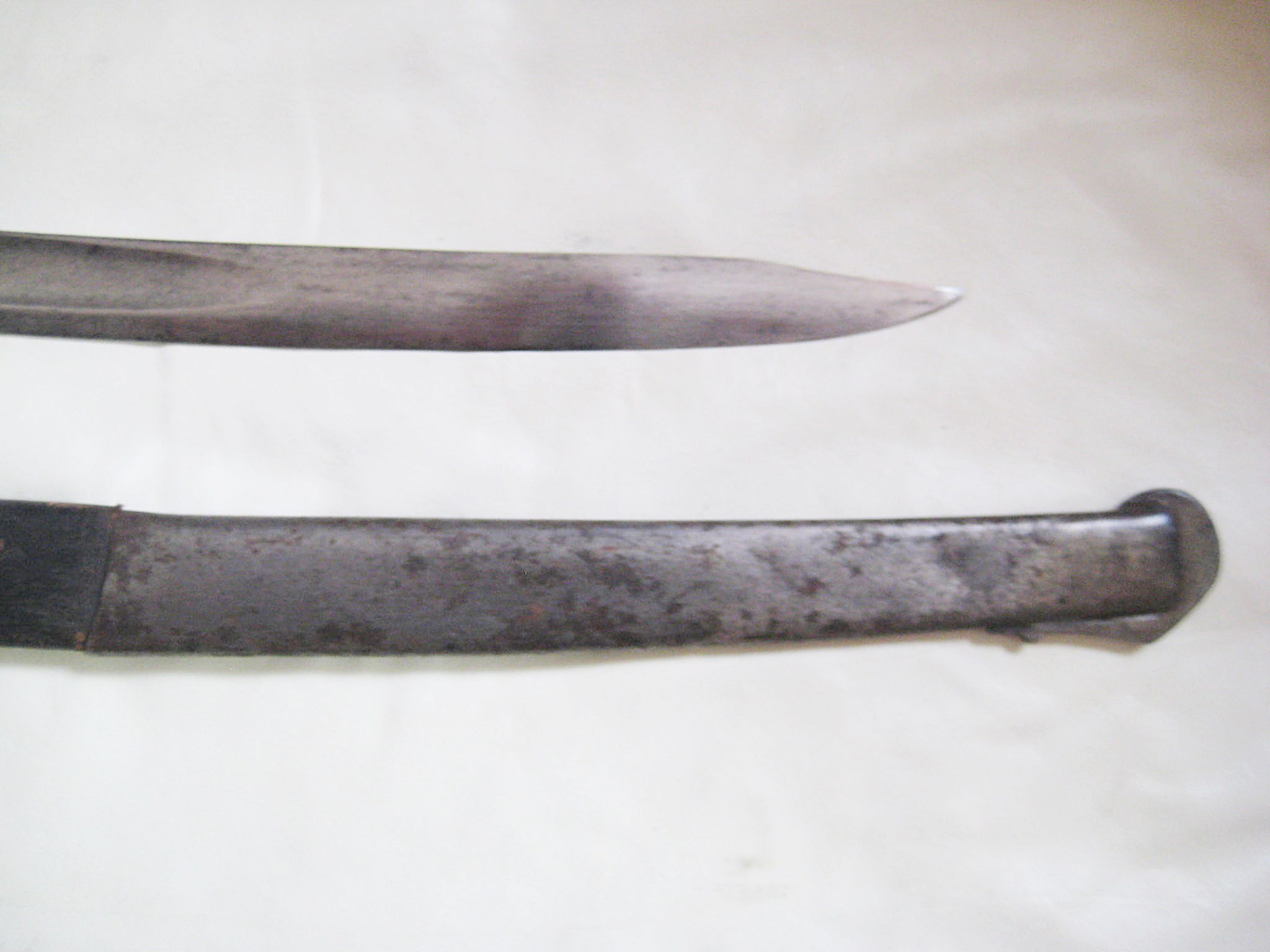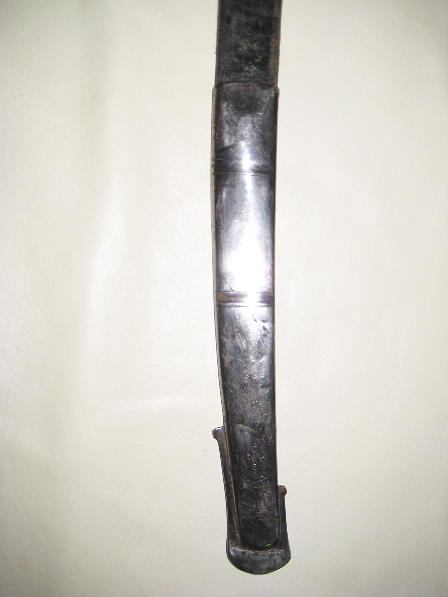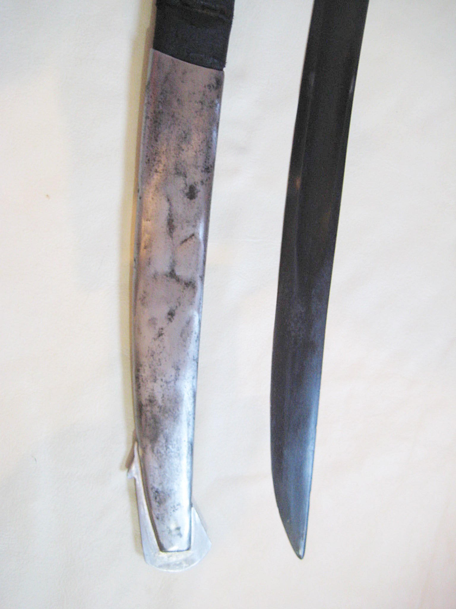 Geschwärzte Lederscheide mit eisernen (und versilberten) Beschlägen. Zusätzlich zum Trageknopf eine Öse zur Aufname eines Tragerings