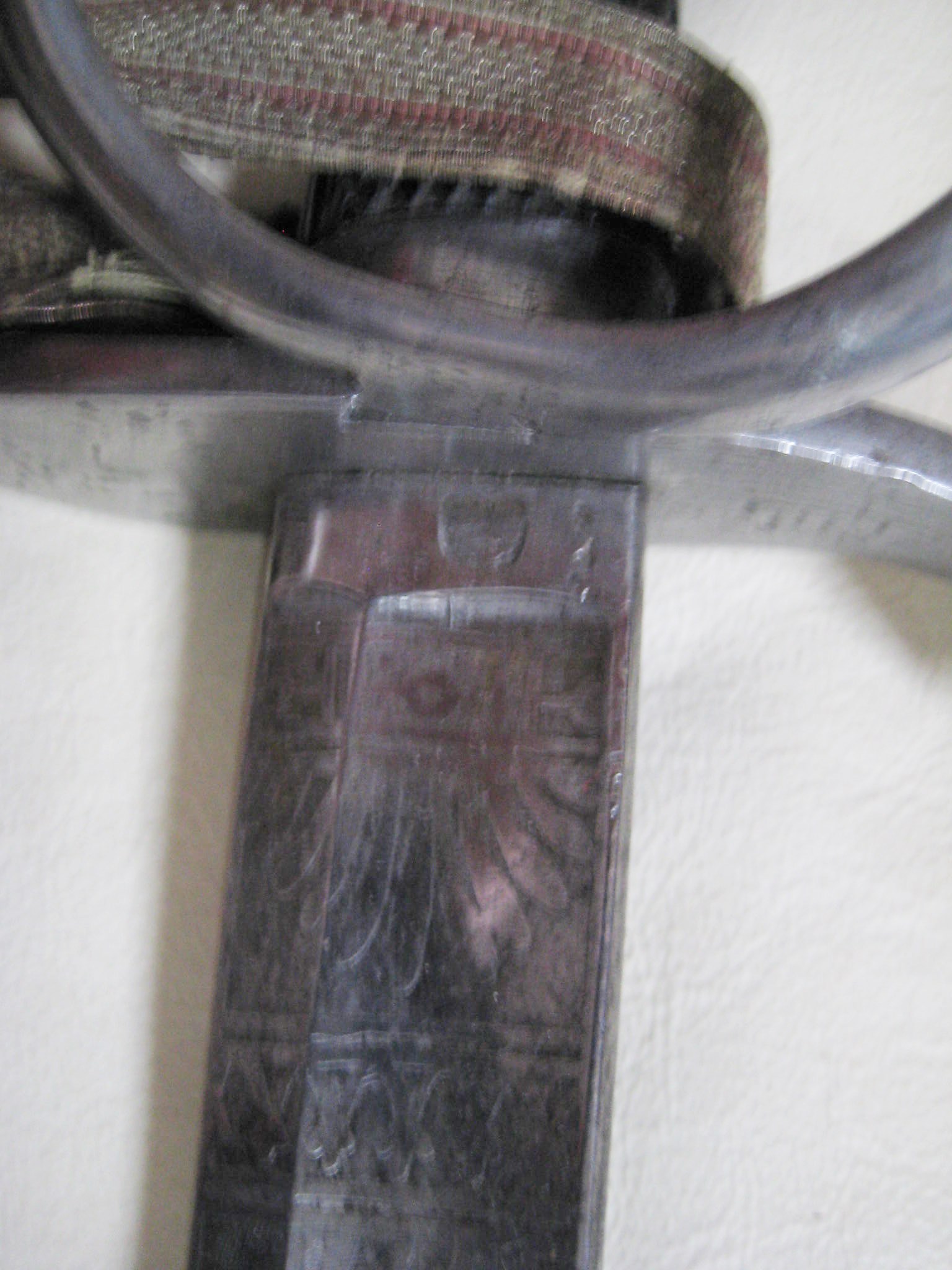 Gebläute und vergoldete Klinge mit beidseitigen flachen Hohlzügen. Solinger Rose auf dem Klingenrücken.