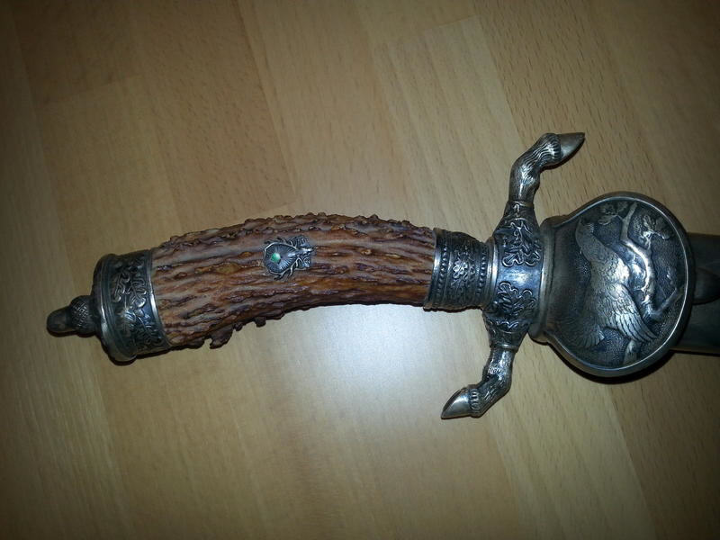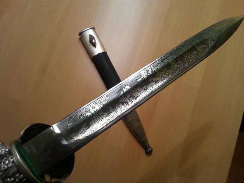 Die Scheide sieht aus wie das spätere Nachkriegsmodel und hat warscheinlich eine Stahl Hulle, und nicht wie die frühe Variant eine Leder Hülle.