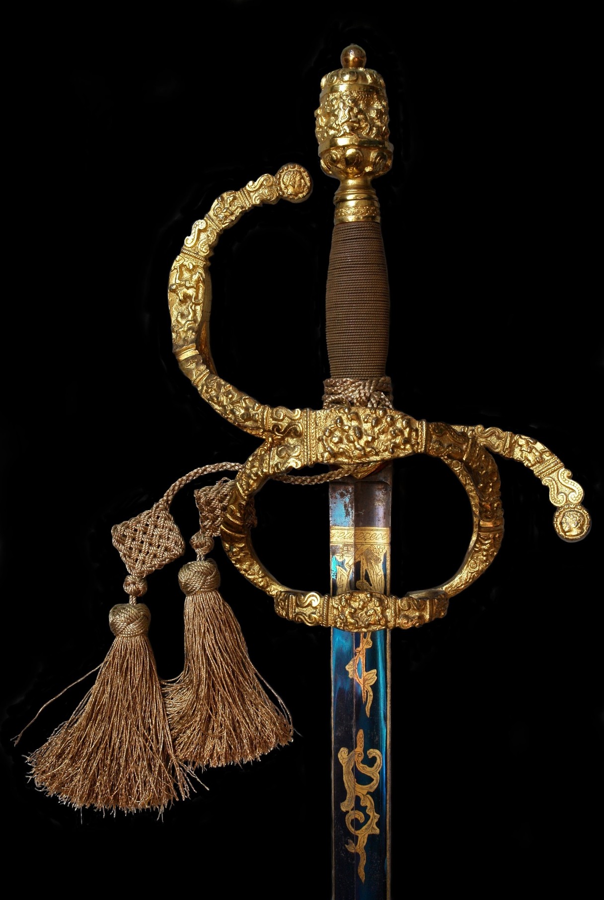 Das prunkvolle vergoldete Gefäß ist einem wallonischen Rapier nachempfunden,