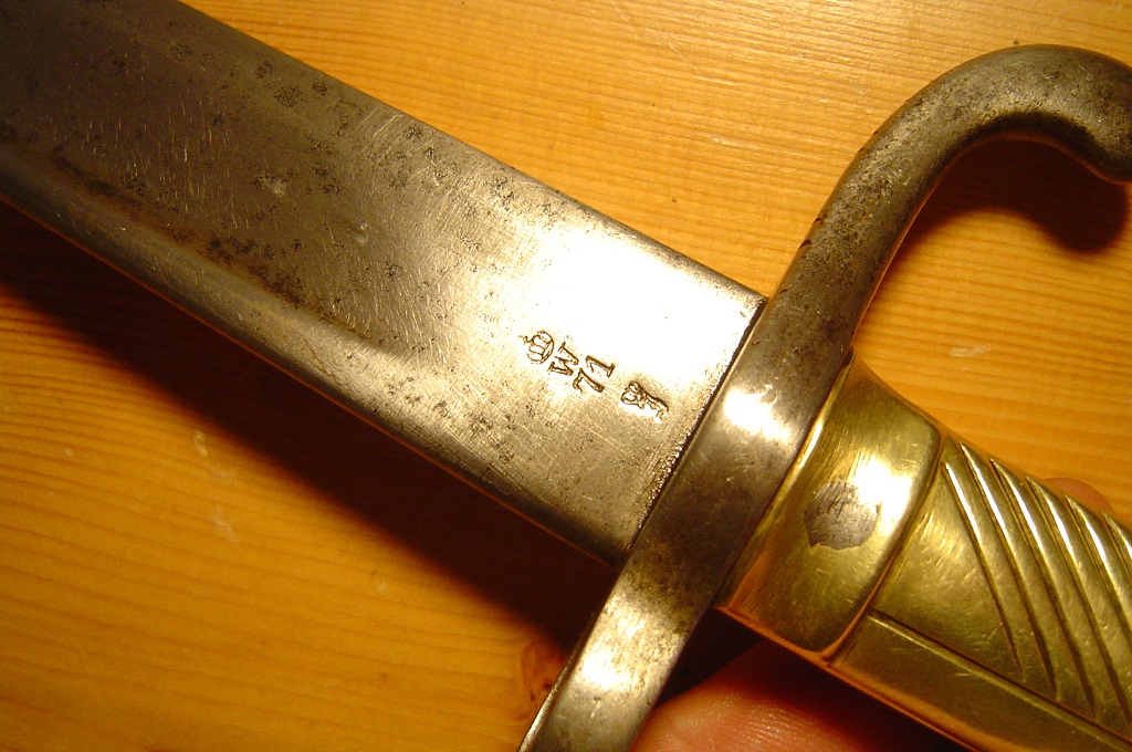 Die Klinge mit spätem Datum W71, da war die Serienproduktion eigentlich schon ausgelaufen, entweder wurde es aus noch vorhandenen Lagerteilen währen des franz. Krieges von 70/71 zusammengebaut, oder eine im Krieg beschädigte Klinge wurde getauscht! Diese späten Daten wie 1871 oder 1872 sind mMn schon selten! Das Datum auf der Parierstange und der Scheide, da leider schwach lesbar, sieht mir nach 68 aus, denke das Scheide und Bajonett so zusammengehören. Das Bajonett hat nur eine dreistellige Depo Nr.