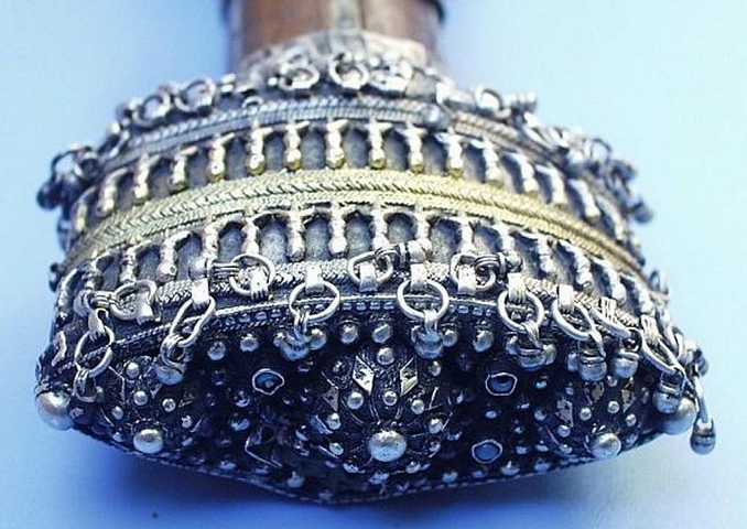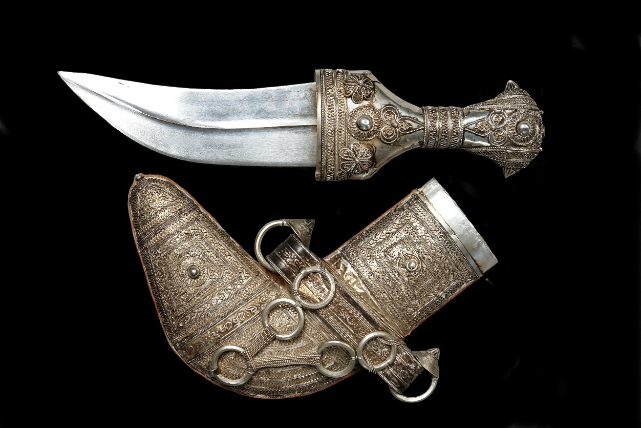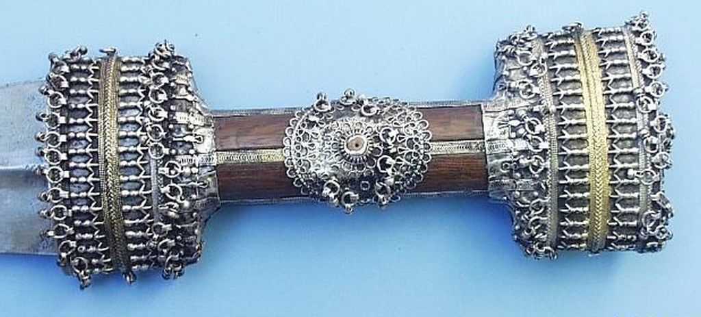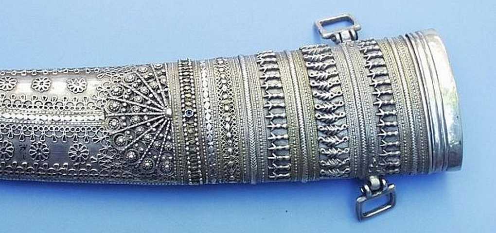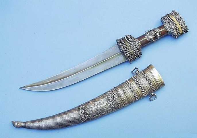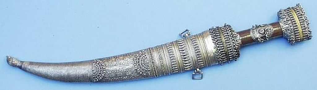 Als die Araber noch nicht vom Öl, sondern vom Ausnehmen der Mekkapilger lebten, hier ein Dolch in außergewöhnlich aufwändiger Verarbeitung. Typisch für diese Dolche von der arabischen Halbinsel ist der Mittelgrat der oft aus zwei Hälften zusammengesetzten Klinge