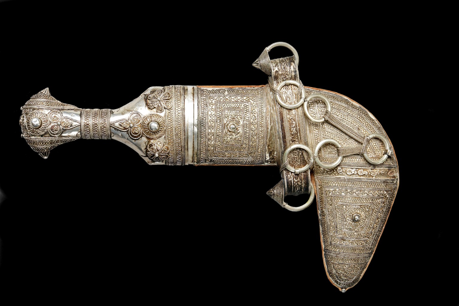 Als die Araber noch nicht vom Öl, sondern vom Ausnehmen der Mekkapilger lebten, hier ein Dolch in außergewöhnlich aufwändiger Verarbeitung. Typisch für diese Dolche von der arabischen Halbinsel ist der Mittelgrat der oft aus zwei Hälften zusammengesetzten Klinge
