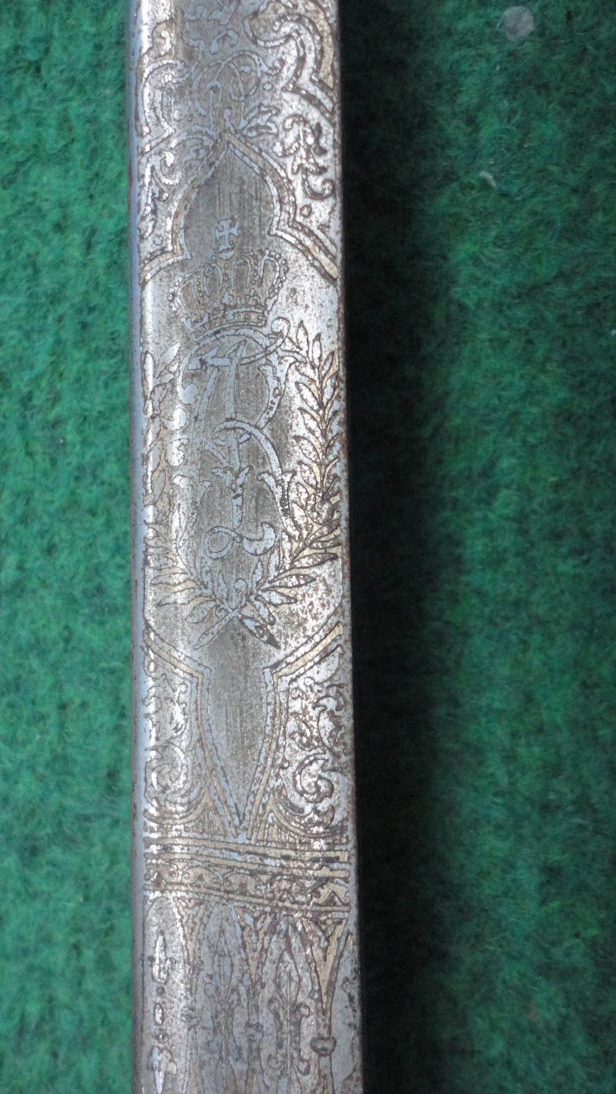 Kavallerie-Offizier-Interimsäbel (K.O.I.) ohne Herrscher-Chiffre auf den Parierstangenlappen, anstelle dessen ein Wappen ohne Krone.